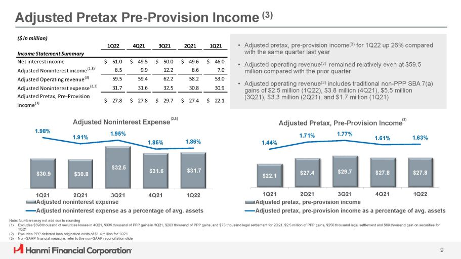 EPS - Diluted $ 0.68 $ 1.09 $ 0.54 ($ million, except EPS) Change (1) 1Q22 4Q21 1Q21 Q/Q Y/Y Income Statement Summary Net interest income $ 51.0 $ 49.5 $ 46.0 2.9% 10.8% Noninterest income 8.5 9.3 9.8 - 8.3% - 13.1% Operating revenue 59.5 58.8 55.8 1.2% 6.6% Noninterest expense 31.7 31.6 29.5 0.2% 7.3% Credit loss (recovery) expense (1.4) (16.0) 2.1 91.4% - 165.2% Pretax income 29.2 43.1 24.2 - 32.4% 20.7% Income tax expense 8.5 9.8 7.5 - 13.4% 12.8% Net income $ 20.7 $ 33.3 $ 16.7 - 37.9% 24.2% Selected balance sheet items Loans receivable $ 5,338 $ 5,152 $ 4,817 3.6% 10.8% Deposits 5,783 5,786 5,510 - 0.1% 5.0% Total assets 6,737 6,859 6,438 - 1.8% 4.6% Stockholders' equity $ 621 $ 643 $ 582 - 3.4% 6.8% Profitability Metrics Return on average assets 1.22% 1.93% 1.08% (71) 14 Return on average equity 12.74% 20.89% 11.63% (815) 111 TCE/TA (2) 9.07% 9.23% 8.87% (16) 20 Net interest margin 3.10% 2.96% 3.09% 14 1 Efficiency ratio 53.29% 53.81% 52.92% (52) 37 Note: numbers may not foot due to rounding (1) Percentage change calculated from dollars in thousands; change in basis points for profitability metrics (2) Non - GAAP financial measure, refer to the non - GAAP reconciliation slide 8 1Q22 Financial Summary