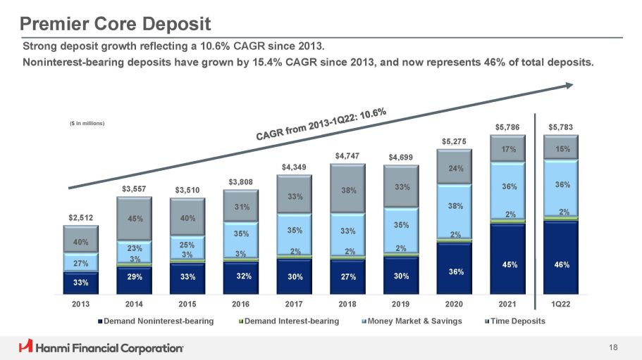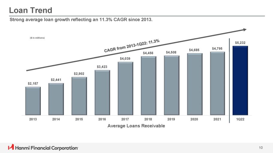 Hanmi Franchise at a Glance Loans $5.3B Deposits $5.8B TCE/TA (2) Ratio 9.07% Second Largest Korean - American Bank in the U.S. • Founded in 1982 in Los Angeles, as the first Korean - American bank • 35 full - service branches and 8 loan production offices across 9 states • Focused on MSAs with high Asian - American and multi - ethnic populations • Strong track record of growth • Well capitalized, significantly above regulatory requirements (1) Loan growth CAGR between 2013, when new senior management was appointed, and 1Q22 (2) Non - GAAP financial measure; refer to the non - GAAP reconciliation slide Loan Growth (1) 11.3% TBVPS (2) $20.02 As of 1Q22 Total Assets $6.7B Experienced Bankers with Deep Community Ties 2 1 3 1 1 1 1 7 1 1 Branch Loan Production Office (LPO) 1 2 2 2 1 3