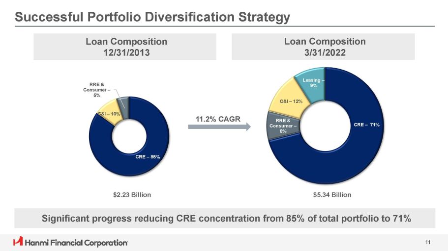 Loan Trend $4,039 $3,423 $2,902 $2,441 $2,157 $4,456 $4,508 $4,685 $4,795 $5,232 2013 2014 2015 2016 2019 2020 2021 1Q22 2017 2018 Average Loans Receivable Strong average loan growth reflecting an 11.3% CAGR since 2013. ($ in millions) 10