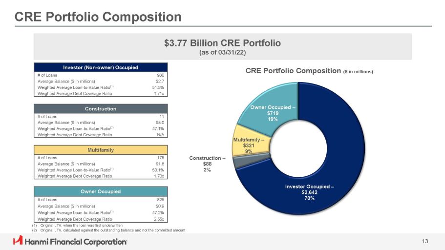 Loan Portfolio Composition RRE & Consumer Portfolio $ in millions Outstanding $433 1Q22 Average Yield 3.46% Commercial & Industrial Portfolio $ in millions Outstanding $633 1Q22 Average Yield 4.06% Commercial Real Estate Portfolio $ in millions Outstanding $3,771 1Q22 Average Yield 4.17% $5.34 Billion Loan Portfolio (as of 03/31/22) Loan Portfolio Composition CRE – 71% 12 RRE & Consumer – 8% Leasing – 9% C&I – 12% Leasing Portfolio $ in millions Outstanding $500 1Q22 Average Yield 4.90%