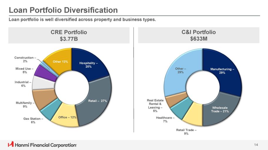 Owner Occupied – $719 19% Multifamily – $321 9% Construction – $88 2% Investor Occupied – $2,642 70% 13 CRE Portfolio Composition Construction # of Loans 11 Average Balance ($ in millions) $8.0 Weighted Average Loan - to - Value Ratio (2) 47.1% Weighted Average Debt Coverage Ratio N/A Multifamily # of Loans 175 Average Balance ($ in millions) $1.8 Weighted Average Loan - to - Value Ratio (1) 50.1% Weighted Average Debt Coverage Ratio 1.70x Investor (Non - owner) Occupied # of Loans 980 Average Balance ($ in millions) $2.7 Weighted Average Loan - to - Value Ratio (1) 51.5% Weighted Average Debt Coverage Ratio 1.71x (1) Original LTV, when the loan was first underwritten (2) Original LTV, calculated against the outstanding balance and not the committed amount $3.77 Billion CRE Portfolio (as of 03/31/22) CRE Portfolio Composition ($ in millions) Owner Occupied # of Loans 825 Average Balance ($ in millions) $0.9 Weighted Average Loan - to - Value Ratio (1) 47.2% Weighted Average Debt Coverage Ratio 2.55x