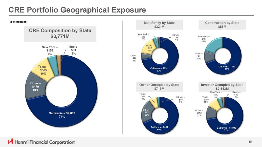 Loan Portfolio Diversification Loan portfolio is well diversified across property and business types. Hospitality – 20% Retail – 27% Office – 12% Gas Station – 6% Multifamily – 9% Industrial – 6% Mixed Use – 5% Construction – 2% Other 13% Manufacturing – 29% 14 Wholesale Trade – 21% Retail Trade – 9% Healthcare – 7% Real Estate Rental & Leasing – 5% Other – 29% C&I Portfolio $633M CRE Portfolio $3.77B