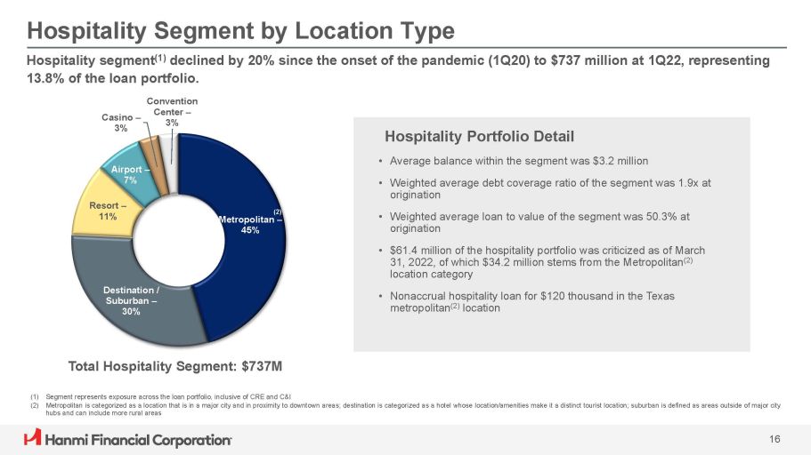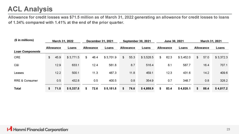 Hanmi Financial Corporation (the “Company”) cautions investors that any statements contained herein that are not historical facts are forward - looking statements within the meaning of the “safe harbor” provisions of the Private Securities Litigation Reform Act of 1995 , including, but not limited to, those statements regarding operating and financial performance, financial position and liquidity, business strategies, regulatory, economic and competitive outlook, investment and expenditure plans, capital and financing needs and availability, litigation, plans and objectives, merger or sale activity, the effects of COVID - 19 on our business, financial condition and results of operations, and all other forecasts and statements of expectation or assumption underlying any of the foregoing . These statements involve known and unknown risks and uncertainties that are difficult to predict . Investors should not rely on any forward - looking statement and should consider risks, such as changes in governmental policy, legislation and regulations, economic climate uncertainty, inflation, fluctuations in interest rate and credit risk, competitive pressures, the ability to succeed in new markets, balance sheet management, the ability to identify and remediate any material weakness in internal controls over financial reporting, and other operational factors . Further, given its ongoing and dynamic nature, it is difficult to predict the full impact of the COVID - 19 pandemic on our business, financial condition and results of operations . The extent of such impact will depend on future developments, which are highly uncertain, including when the coronavirus can be controlled and abated . As the result of the COVID - 19 pandemic and the related adverse local and national economic consequences, we could be subject to various risks, any of which could have a material, adverse effect on our business, financial condition, liquidity, and results of operations . Forward - looking statements are based upon the good faith beliefs and expectations of management as of this date only and are further subject to additional risks and uncertainties, including, but not limited to, the risk factors set forth in our earnings release dated April 26 , 2022 , including the section titled “Forward Looking Statements and the Company’s most recent Form 10 - K, 10 - Q and other filings with the Securities and Exchange Commission (“SEC”) . Investors are urged to review our earnings release dated April 26 , 2022 , including the section titled “Forward Looking Statements and the Company’s SEC filings . The Company disclaims any obligation to update or revise the forward - looking statements herein . 2 Forward - Looking Statements