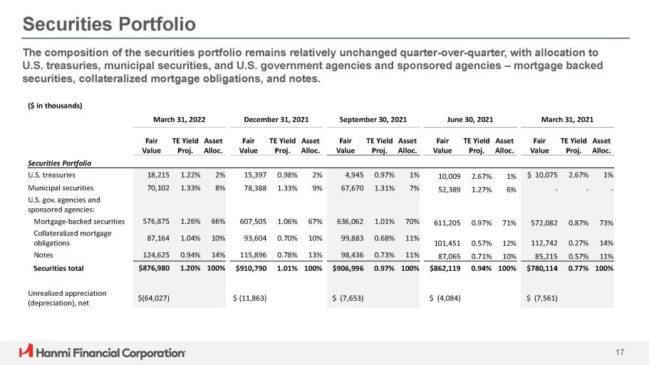 Securities Portfolio 17 The composition of the securities portfolio remains relatively unchanged quarter - over - quarter, with allocation to U.S. treasuries, municipal securities, and U.S. government agencies and sponsored agencies – mortgage backed securities, collateralized mortgage obligations, and notes. ($ in thousands) March 31, 2022 December 31, 2021 September 30, 2021 June 30, 2021 March 31, 2021 Fair Value TE Yield Proj. Asset Alloc. Fair Value TE Yield Proj. Asset Alloc. Fair Value TE Yield Proj. Asset Alloc. Fair Value TE Yield Proj. Asset Alloc. Fair Value TE Yield Proj. Asset Alloc. Securities Portfolio U.S. treasuries 18,215 1.22% 2% 15,397 0.98% 2% 4,945 0.97% 1% 10,009 2.67% 1% $ 10,075 2.67% 1% Municipal securities 70,102 1.33% 8% 78,388 1.33% 9% 67,670 1.31% 7% 52,389 1.27% 6% - - - U.S. gov. agencies and sponsored agencies: Mortgage - backed securities 576,875 1.26% 66% 607,505 1.06% 67% 636,062 1.01% 70% 611,205 0.97% 71% 572,082 0.87% 73% Collateralized mortgage obligations 87,164 1.04% 10% 93,604 0.70% 10% 99,883 0.68% 11% 101,451 0.57% 12% 112,742 0.27% 14% Notes 124,625 0.94% 14% 115,896 0.78% 13% 98,436 0.73% 11% 87,065 0.71% 10% 85,215 0.57% 11% Securities total $876,980 1.20% 100% $910,790 1.01% 100% $906,996 0.97% 100% $862,119 0.94% 100% $780,114 0.77% 100% Unrealized appreciation (depreciation), net $(64,027) $ (11,863) $ (7,653) $ (4,084) $ (7,561)