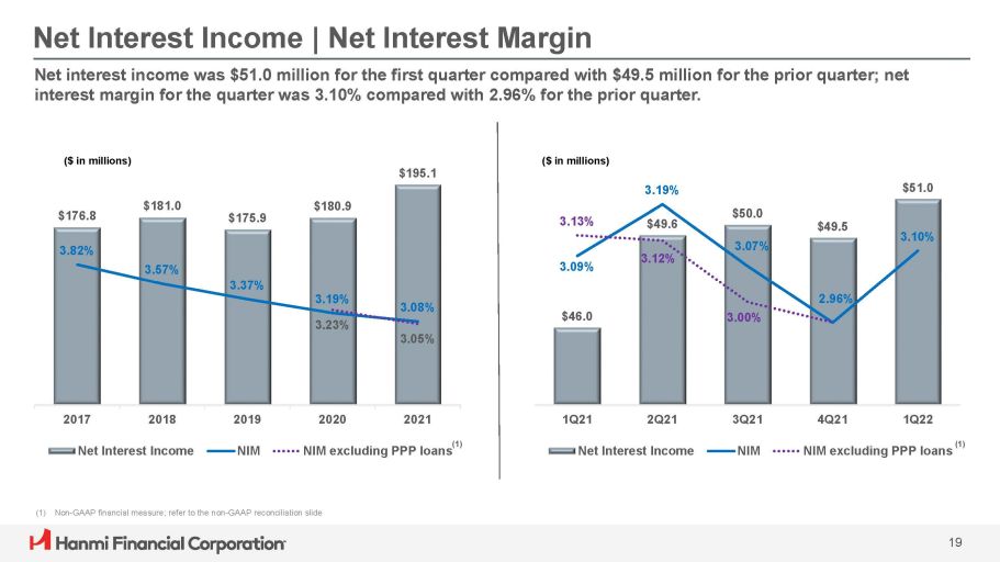 Non - GAAP Reconciliation – PPP (FY 2020) GAAP financial measures that may be used by other companies. 37 (1) Net interest income (as applicable) divided by average interest - earning assets (as applicable), annualized (2) Noninterest expense (as applicable) divided by the sum of net interest income and noninterest income (as applicable) In response to the COVID - 19 pandemic, the Coronavirus Aid, Relief and Economic Security Act (the “CARES Act”) was adopted, which included authorization for the U.S. Small Business Administration (the “SBA”) to introduce a new program, entitled the “Paycheck Protection Program,” which provides loans for eligible businesses through the SBA’s 7(a) loan guaranty program. These loans are fully guaranteed and available for loan forgiveness of up to the full principal amount so long as certain employee and compensation levels of the business are maintained and the proceeds of the loan are used as required under the program. The Paycheck Protection Program (“PPP”) and loan forgiveness provide economic relief to small businesses nationwide adversely impacted under the COVID - 19 pandemic. Hanmi participated in this program and the financial information for the 2021 fourth quarter reflects this participation. This table shows financial information excluding the effect of the origination of the PPP loans, including the corresponding interest income earned and non - interest expense incurred on such loans, which constitutes a non - GAAP measure. Management believes the presentation of certain financial measures excluding the effect of PPP loans provides useful supplemental information that is essential to a proper understanding of the financial condition and results of operations of Hanmi. This disclosure should not be viewed as a substitution for results determined in accordance with GAAP, nor is it necessarily comparable to non - ($ in thousands, except share and per share data) For the Twelve Months Ended December 31, 2020 Net Interest Margin Net interest income $ 180,898 Less PPP loan interest income (4,593) Net interest income adjusted for PPP loans $ 176,305 Average interest - earning assets $ 5,671,265 Less average PPP loans (217,999) Average interest - earning assets adjusted for PPP loans $ 5,453,266 NIM (1) 3.19% NIM adjusted for PPP loans (1) 3.23% Efficiency Ratio Noninterest expense $ 119,053 Less PPP deferred origination costs 3,064 Noninterest expense adjusted for PPP loans $ 122,117 Net interest income plus noninterest income $ 224,002 Less net gain on sales of securities (15,712) Net interest income plus noninterest income adjusted for securities gains $ 208,290 Efficiency ratio (2) 53.15% Efficiency ratio adjusted for PPP loans and securities gains (2) 58.63%