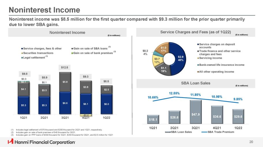 Net Interest Income | Net Interest Margin $176.8 $181.0 $175.9 $180.9 $195.1 3.82% 3.57% 3.37% 3.08% 3.19% 3.23% 3.05% 2019 2020 2021 2017 2018 Net Interest Income NIM NIM excluding PPP loans Net interest income was $51.0 million for the first quarter compared with $49.5 million for the prior quarter; net interest margin for the quarter was 3.10% compared with 2.96% for the prior quarter. ($ in millions) $46.0 $49.6 $50.0 $49.5 $51.0 3.09% 3.19% 3.07% 2.96% 3.10% 3.13% 3.12% 3.00% 3Q21 4Q21 1Q22 NIM excluding PPP loans 1Q21 2Q21 Net Interest Income NIM ($ in millions) 19 (1) Non - GAAP financial measure; refer to the non - GAAP reconciliation slide (1) (1)