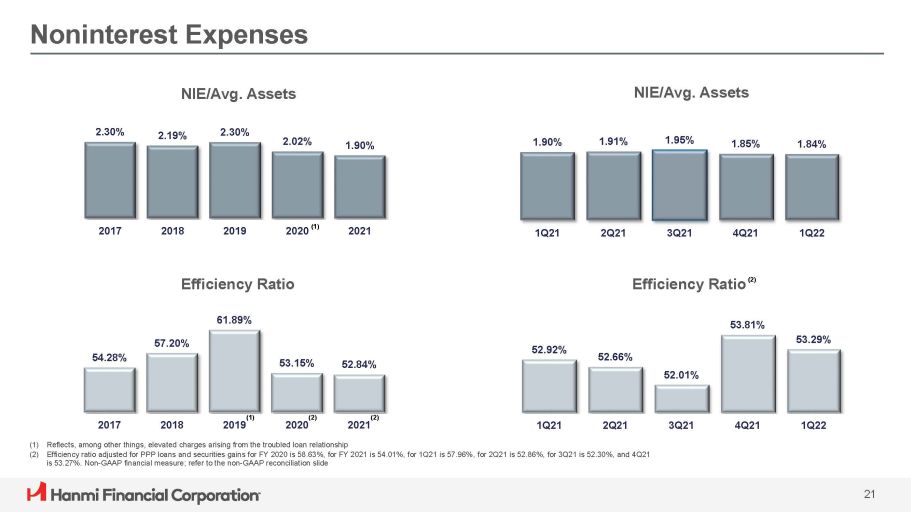 Noninterest Income Noninterest Income ($ in millions) Service Charges and Fees (as of 1Q22) ($ in millions) $18.1 $26.6 $47.9 $36.6 $29.6 10.66% 12.55% 11.85% 10.98% 9.85% 1Q21 2Q21 3Q21 1Q22 4Q21 SBA Trade Premium SBA Loan Sales Noninterest income was $8.5 million for the first quarter compared with $9.3 million for the prior quarter primarily due to lower SBA gains. (1) Includes legal settlement of $75 thousand and $250 thousand for 2Q21 and 1Q21, respectively. (2) Includes gain on sale of bank premises of $45 thousand for 3Q21. (3) Includes gain on PPP loans of $339 thousand for 3Q21, $203 thousand for 2Q21, and $2.5 million for 1Q21 (3) Gain on sale of SBA loans (2) Gain on sale of bank premises $5.3 $5.3 $6.6 $6.1 $6.0 $4.1 $3.5 $5.8 $3.8 $2.5 $0.3 $0.1 $0.1 1Q21 2Q21 3Q21 - $0.6 4Q21 1Q22 Service charges, fees & other Securities transactions Legal settlement (1) $12.5 $9.3 $8.9 $9.8 $8.5 $2.9 48% $1.1 19% $0.7 12% $0.2 4% $1.0 17% Service charges on deposit accounts Trade finance and other service charges and fees Servicing income Bank - owned life insurance income All other operating income SBA Loan Sales 20 ($ in millions)