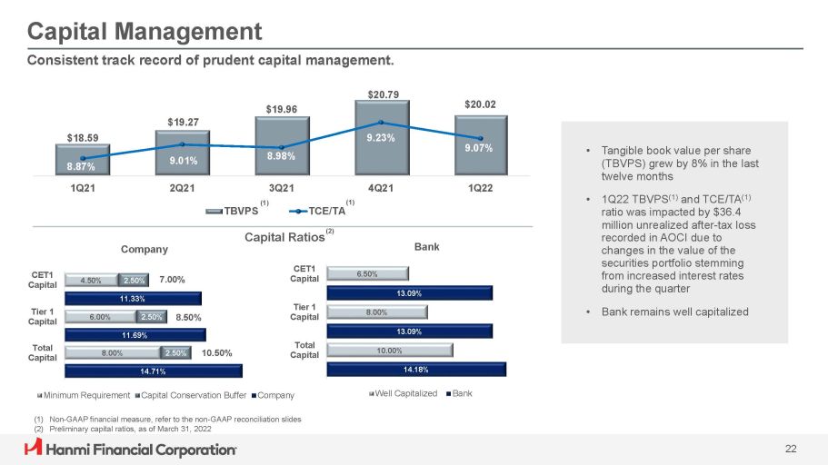 Noninterest Expenses 52.92% 52.66% 52.01% 53.81% 53.29% 3Q21 4Q21 1Q22 Efficiency Ratio (2) 2.30% 2.19% 2.30% 2.02% 1.90% 2017 2018 2019 2020 (1) 2021 NIE/Avg. Assets 54.28% 57.20% 61.89% 53.15% 52.84% 2017 2018 2019 (2) 2021 1Q21 2Q21 (2) 2020 Efficiency Ratio 1.90% 21 1.91% 1.95% 1.85% 1.84% 1Q21 2Q21 3Q21 4Q21 1Q22 NIE/Avg. Assets (1) Reflects, among other things, elevated charges arising from the troubled loan relationship (2) Efficiency ratio adjusted for PPP loans and securities gains for FY 2020 is 58.63%, for FY 2021 is 54.01%, for 1Q21 is 57.96%, for 2Q21 is 52.86%, for 3Q21 is 52.30%, and 4Q21 is 53.27%. Non - GAAP financial measure; refer to the non - GAAP reconciliation slide (1)