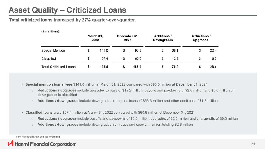 ACL Analysis Allowance for credit losses was $71.5 million as of March 31, 2022 generating an allowance for credit losses to loans of 1.34% compared with 1.41% at the end of the prior quarter. ($ in millions) 23 March 31, 2022 December 31, 2021 September 30, 2021 June 30, 2021 March 31, 2021 Allowance Loans Allowance Loans Allowance Loans Allowance Loans Allowance Loans Loan Components CRE $ 45.9 $ 3,771.5 $ 48.4 $ 3,701.9 $ 55.3 $ 3,528.5 $ 62.3 $ 3,452.0 $ 57.0 $ 3,372.3 C&I 12.9 633.1 12.4 561.8 8.7 516.4 8.1 587.7 16.4 707.1 Leases 12.2 500.1 11.3 487.3 11.8 459.1 12.3 431.6 14.2 409.6 RRE & Consumer 0.5 432.8 0.5 400.5 0.8 354.9 0.7 348.7 0.8 328.2 Total $ 71.5 $ 5,337.5 $ 72.6 $ 5,151.5 $ 76.6 $ 4,858.9 $ 83.4 $ 4,820.1 $ 88.4 $ 4,817.2