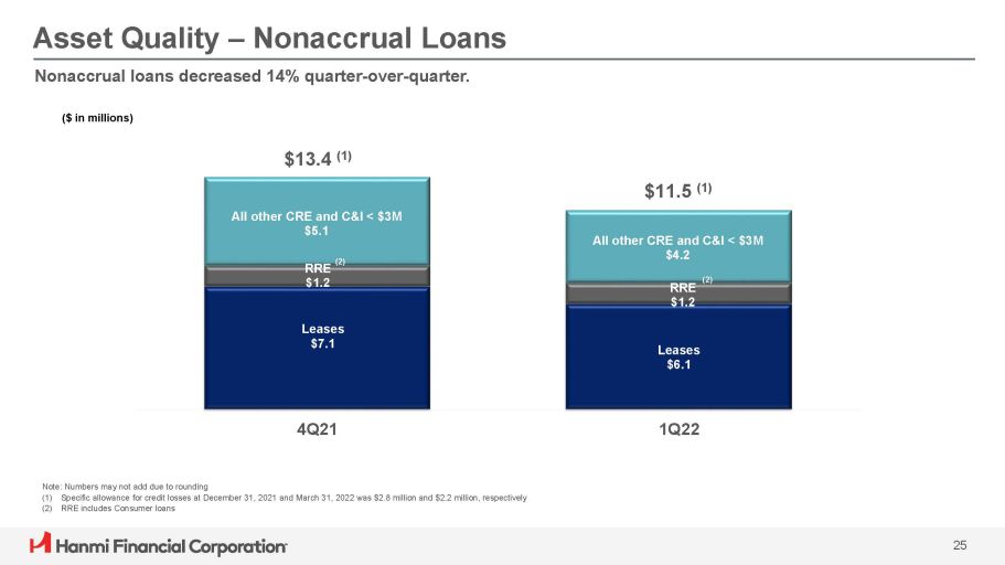 Asset Quality – Criticized Loans 24 Total criticized loans increased by 27% quarter - over - quarter. Note: Numbers may not add due to rounding • Special mention loans were $141.0 million at March 31, 2022 compared with $95.3 million at December 31, 2021 o Reductions / upgrades include upgrades to pass of $19.2 million, payoffs and paydowns of $2.6 million and $0.6 million of downgrades to classified o Additions / downgrades include downgrades from pass loans of $66.3 million and other additions of $1.8 million • Classified loans were $57.4 million at March 31, 2022 compared with $60.6 million at December 31, 2021 o Reductions / upgrades include payoffs and paydowns of $3.5 million, upgrades of $2.2 million and charge - offs of $0.3 million o Additions / downgrades include downgrades from pass and special mention totaling $2.8 million ($ in millions) March 31, 2022 December 31, 2021 Additions / Downgrades Reductions / Upgrades Special Mention $ 141.0 $ 95.3 $ 68.1 $ 22.4 Classified $ 57.4 $ 60.6 $ 2.8 $ 6.0 Total Criticized Loans $ 198.4 $ 155.9 $ 70.9 $ 28.4