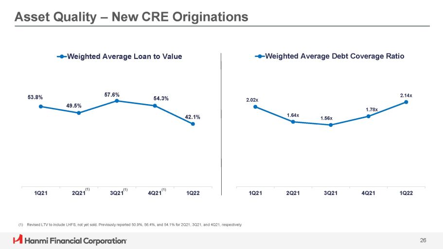 Asset Quality – Nonaccrual Loans Nonaccrual loans decreased 14% quarter - over - quarter. ($ in millions) Note: Numbers may not add due to rounding (1) Specific allowance for credit losses at December 31, 2021 and March 31, 2022 was $2.8 million and $2.2 million, respectively (2) RRE includes Consumer loans Leases $7.1 25 Leases $6.1 RRE $1.2 All other CRE and C&I < $3M $5.1 All other CRE and C&I < $3M $4.2 4Q21 1Q22 $11.5 (1) $13.4 (1) (2) (2) RRE $1.2