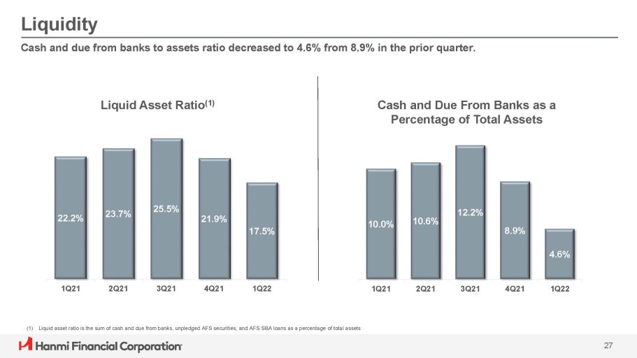 Liquidity Cash and due from banks to assets ratio decreased to 4.6% from 8.9% in the prior quarter. Liquid Asset Ratio (1) (1) Liquid asset ratio is the sum of cash and due from banks, unpledged AFS securities, and AFS SBA loans as a percentage of total assets Cash and Due From Banks as a Percentage of Total Assets 22.2% 23.7% 25.5% 21.9% 17.5% 1Q21 2Q21 3Q21 4Q21 1Q22 10.0% 10.6% 12.2% 8.9% 4.6% 1Q21 2Q21 3Q21 4Q21 1Q22 27