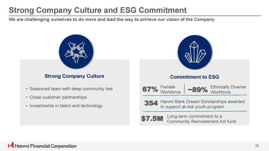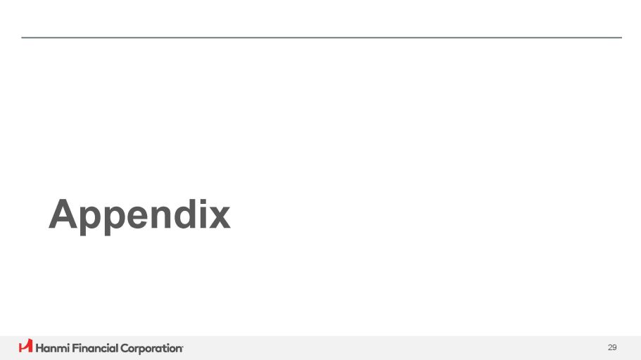Strong Company Culture and ESG Commitment We are challenging ourselves to do more and lead the way to achieve our vision of the Company • Seasoned team with deep community ties • Close customer partnerships • Investments in talent and technology Strong Company Culture Commitment to ESG 67% Female ~89% Ethnically Diverse Workforce Workforce to support at - risk youth program $7.5M 354 Hanmi Bank Dream Scholarships awarded 28 Long - term commitment to a Community Reinvestment Act fund