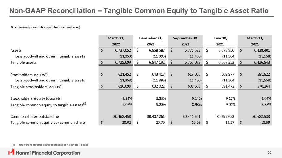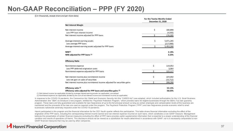 Non - GAAP Reconciliation – PPP (1Q21) As of March 31, 2021 Tangible Common Equity to Tangible Assets Tangible assets $ 6,426,843 Less first and second draw PPP loans (278,200) Tangible assets adjusted for PPP loans $ 6,148,643 Tangible stockholders' equity (1) $ 570,264 TCE / TA Ratio (1) 8.87% TCE / TA Ratio adjusted for PPP loans (1) 9.27% Allowance for Credit Losses to Loans Receivable Allowance for credit losses $ 88,392 Loans receivable $ 4,817,151 Less first draw PPP loans (256,457) Loans receivable adjusted for PPP loans $ 4,560,694 ACL / Loans Receivable 1.83% ACL / Loans Receivable adjusted for PPP loans 1.94% Three Months Ended March 31, 2021 measures that may be used by other companies. 36 Net Interest Margin Net interest income Less PPP loan interest income Net interest income adjusted for PPP loans $ 46,001 (1,865) $ 44,136 Average interest - earning assets Less average PPP loans Average interest - earning assets adjusted for PPP loans 6,029,834 (308,543) $ 5,721,291 NIM (2) NIM adjusted for PPP loans (2) 3.09% 3.13% Efficiency Ratio Noninterest expense Add back PPP deferred origination costs Noninterest expense adjusted for PPP loans $ 29,535 1,390 $ 30,925 $ 55,809 Net interest income plus noninterest income Less securities and PPP gains (2,553) Net interest income plus noninterest income adjusted for securities and PPP gains $ 53,256 Efficiency ratio (3) 52.92% Efficiency ratio adjusted for PPP loans and securities gains (3) 58.07% (1) There were no preferred shares outstanding at March 31, 2021 (2) Net interest income (as applicable) divided by average interest - earning assets (as applicable), annualized (3) Noninterest expense (as applicable) divided by the sum of net interest income and noninterest income (as applicable) In response to the COVID - 19 pandemic, the Coronavirus Aid, Relief and Economic Security Act (the “CARES Act”) was adopted, which included authorization for the U.S. Small Business Administration (the “SBA”) to introduce a new program, entitled the “Paycheck Protection Program,” which provides loans for eligible businesses through the SBA’s 7(a) loan guaranty program. These loans are fully guaranteed and available for loan forgiveness of up to the full principal amount so long as certain employee and compensation levels of the business are maintained and the proceeds of the loan are used as required under the program. The Paycheck Protection Program (“PPP”) and loan forgiveness provide economic relief to small businesses nationwide adversely impacted under the COVID - 19 pandemic. Hanmi participated in this program and the financial information for the 2021 first quarter reflects this participation. This table shows financial information excluding the effect of the origination of the PPP loans, including the corresponding interest income earned and non - interest expense incurred on such loans, which constitutes a non - GAAP measure. Management believes the presentation of certain financial measures excluding the effect of PPP loans provides useful supplemental information that is essential to a proper understanding of the financial condition and results of operations of Hanmi. This disclosure should not be viewed as a substitution for results determined in accordance with GAAP, nor is it necessarily comparable to non - GAAP financial ($ in thousands, except share and per share data)