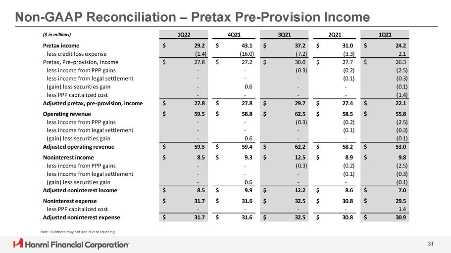 Non - GAAP Reconciliation – PPP (FY 2021) (1) Net interest income (as applicable) divided by average interest - earning assets (as applicable), annualized (2) Noninterest expense (as applicable) divided by the sum of net interest income and noninterest income (as applicable) In response to the COVID - 19 pandemic, the Coronavirus Aid, Relief and Economic Security Act (the “CARES Act”) was adopted, which included authorization for the U.S. Small Business Administration (the “SBA”) to introduce a new program, entitled the “Paycheck Protection Program,” which provides loans for eligible businesses through the SBA’s 7(a) loan guaranty program. These loans are fully guaranteed and available for loan forgiveness of up to the full principal amount so long as certain employee and compensation levels of the business are maintained and the proceeds of the loan are used as required under the program. The Paycheck Protection Program (“PPP”) and loan forgiveness provide economic relief to small businesses nationwide adversely impacted under the COVID - 19 pandemic. Hanmi participated in this program and the financial information for the 2021 fourth quarter reflects this participation. This table shows financial information excluding the effect of the origination of the PPP loans, including the corresponding interest income earned and non - interest expense incurred on such loans, which constitutes a non - GAAP measure. Management believes the presentation of certain financial measures excluding the effect of PPP loans provides useful supplemental information that is essential to a proper understanding of the financial condition and results of operations of Hanmi. This disclosure should not be viewed as a substitution for results determined in accordance with GAAP, nor is it necessarily comparable to non - GAAP financial measures that may be used by other companies. ($ in thousands, except share and per share data) For the Twelve Months Ended December 31, 2021 Net Interest Margin Net interest income $ 195,050 Less PPP loan interest income (5,593) Net interest income adjusted for PPP loans $ 189,057 Average interest - earning assets $ 6,340,769 Less average PPP loans (142,646) Average interest - earning assets adjusted for PPP loans $ 6,198,123 NIM (1) 3.08% NIM adjusted for PPP loans (1) 3.05% Efficiency Ratio Noninterest expense $ 124,455 Add back PPP deferred origination costs 1,403 Noninterest expense adjusted for PPP loans $ 125,858 Net interest income plus noninterest income $ 235,546 Less net gain on sales of securities (2,498) Net interest income plus noninterest income adjusted for securities gains $ 233,048 Efficiency ratio (2) 52.84% Efficiency ratio adjusted for PPP loans and securities gains (2) 54.01% 32