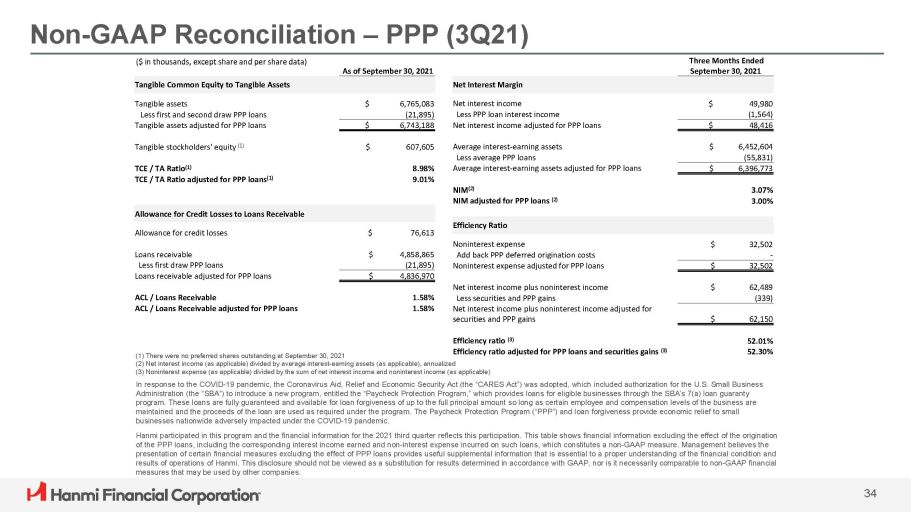 Non - GAAP Reconciliation – PPP (4Q21) As of December 31, 2021 Tangible Common Equity to Tangible Assets Tangible assets $ 6,847,192 Less first and second draw PPP loans (2,976) Tangible assets adjusted for PPP loans $ 6,844,216 Tangible stockholders' equity (1) $ 632,022 TCE / TA Ratio (1) 9.23% TCE / TA Ratio adjusted for PPP loans (1) 9.23% Allowance for Credit Losses to Loans Receivable Allowance for credit losses $ 72,557 Loans receivable $ 5,151,541 Less first draw PPP loans (2,976) Loans receivable adjusted for PPP loans $ 5,148,565 ACL / Loans Receivable 1.41% ACL / Loans Receivable adjusted for PPP loans 1.41% Three Months Ended December 31, 2021 (3) Noninterest expense (as applicable) divided by the sum of net interest income and noninterest income (as applicable) In response to the COVID - 19 pandemic, the Coronavirus Aid, Relief and Economic Security Act (the “CARES Act”) was adopted, which included authorization for the U.S. Small Business Administration (the “SBA”) to introduce a new program, entitled the “Paycheck Protection Program,” which provides loans for eligible businesses through the SBA’s 7(a) loan guaranty program. These loans are fully guaranteed and available for loan forgiveness of up to the full principal amount so long as certain employee and compensation levels of the business are maintained and the proceeds of the loan are used as required under the program. The Paycheck Protection Program (“PPP”) and loan forgiveness provide economic relief to small businesses nationwide adversely impacted under the COVID - 19 pandemic. Hanmi participated in this program and the financial information for the 2021 fourth quarter reflects this participation. This table shows financial information excluding the effect of the origination of the PPP loans, including the corresponding interest income earned and non - interest expense incurred on such loans, which constitutes a non - GAAP measure. Management believes the presentation of certain financial measures excluding the effect of PPP loans provides useful supplemental information that is essential to a proper understanding of the financial condition and results of operations of Hanmi. This disclosure should not be viewed as a substitution for results determined in accordance with GAAP, nor is it necessarily comparable to non - GAAP financial measures that may be used by other companies. 33 Net Interest Margin Net interest income Less PPP loan interest income Net interest income adjusted for PPP loans $ 49,496 (100) $ 49,396 Average interest - earning assets Less average PPP loans Average interest - earning assets adjusted for PPP loans $ 6,630,386 (5,883) $ 6,624,503 NIM (2) NIM adjusted for PPP loans (2) 2.96% 2.96% Efficiency Ratio Noninterest expense Add back PPP deferred origination costs Noninterest expense adjusted for PPP loans $ 31,636 - $ 31,636 $ 58,791 598 Net interest income plus noninterest income Plus securities losses Net interest income plus noninterest income adjusted for securities losses $ 59,389 Efficiency ratio (3) 53.81% Efficiency ratio adjusted for PPP loans and securities losses (3) 53.27% ($ in thousands, except share and per share data) (1) There were no preferred shares outstanding at December 31, 2021 (2) Net interest income (as applicable) divided by average interest - earning assets (as applicable), annualized