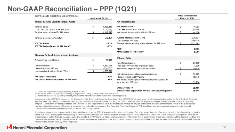 Non - GAAP Reconciliation – PPP (2Q21) GAAP financial measures that may be used by other companies. 35 As of June 30, 2021 Tangible Common Equity to Tangible Assets Tangible assets $ 6,567,352 Less first and second draw PPP loans (158,134) Tangible assets adjusted for PPP loans $ 6,409,218 Tangible stockholders' equity (1) $ 591,473 TCE / TA Ratio (1) 9.01% TCE / TA Ratio adjusted for PPP loans (1) 9.23% Allowance for Credit Losses to Loans Receivable Allowance for credit losses $ 83,372 Loans receivable $ 4,820,092 Less first draw PPP loans (144,077) Loans receivable adjusted for PPP loans $ 4,676,015 ACL / Loans Receivable 1.73% ACL / Loans Receivable adjusted for PPP loans 1.78% Three Months Ended June 30, 2021 Net Interest Margin Net interest income Less PPP loan interest income Net interest income adjusted for PPP loans $ 49,572 (2,680) $ 46,892 Average interest - earning assets Less average PPP loans Average interest - earning assets adjusted for PPP loans 6,242,421 (220,965) $ 6,021,456 NIM (2) NIM adjusted for PPP loans (2) 3.19% 3.12% Efficiency Ratio Noninterest expense Add back PPP deferred origination costs Noninterest expense adjusted for PPP loans $ 30,783 13 $ 30,796 $ 58,458 Net interest income plus noninterest income Less securities and PPP gains (203) Net interest income plus noninterest income adjusted for securities and PPP gains $ 58,255 Efficiency ratio (3) 52.66% Efficiency ratio adjusted for PPP loans and securities gains (3) 52.86% (1) There were no preferred shares outstanding at June 30, 2021 (2) Net interest income (as applicable) divided by average interest - earning assets (as applicable), annualized (3) Noninterest expense (as applicable) divided by the sum of net interest income and noninterest income (as applicable) In response to the COVID - 19 pandemic, the Coronavirus Aid, Relief and Economic Security Act (the “CARES Act”) was adopted, which included authorization for the U.S. Small Business Administration (the “SBA”) to introduce a new program, entitled the “Paycheck Protection Program,” which provides loans for eligible businesses through the SBA’s 7(a) loan guaranty program. These loans are fully guaranteed and available for loan forgiveness of up to the full principal amount so long as certain employee and compensation levels of the business are maintained and the proceeds of the loan are used as required under the program. The Paycheck Protection Program (“PPP”) and loan forgiveness provide economic relief to small businesses nationwide adversely impacted under the COVID - 19 pandemic. Hanmi participated in this program and the financial information for the 2021 second quarter reflects this participation. This table shows financial information excluding the effect of the origination of the PPP loans, including the corresponding interest income earned and non - interest expense incurred on such loans, which constitutes a non - GAAP measure. Management believes the presentation of certain financial measures excluding the effect of PPP loans provides useful supplemental information that is essential to a proper understanding of the financial condition and results of operations of Hanmi. This disclosure should not be viewed as a substitution for results determined in accordance with GAAP, nor is it necessarily comparable to non - ($ in thousands, except share and per share data)