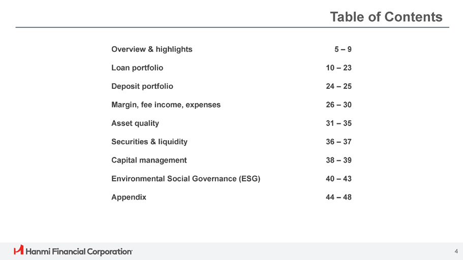 This presentation contains financial information determined by methods other than in accordance with accounting principles generally accepted in the United States of America (“GAAP”) . These non - GAAP measures include tangible common equity to tangible assets, and tangible common equity per share . Management uses these “non - GAAP” measures in its analysis of the Company’s performance . Management believes these non - GAAP financial measures allow for better comparability of period to period operating performance . Additionally, the Company believes this information is utilized by regulators and market analysts to evaluate a company’s financial condition and therefore, such information is useful to investors . These disclosures should not be viewed as a substitute for operating results determined in accordance with GAAP, nor are they necessarily comparable to non - GAAP performance measures that may be presented by other companies . A reconciliation of the non - GAAP measures used in this presentation to the most directly comparable GAAP measures is provided in the Appendix to this presentation . 3 Non - GAAP Financial Information