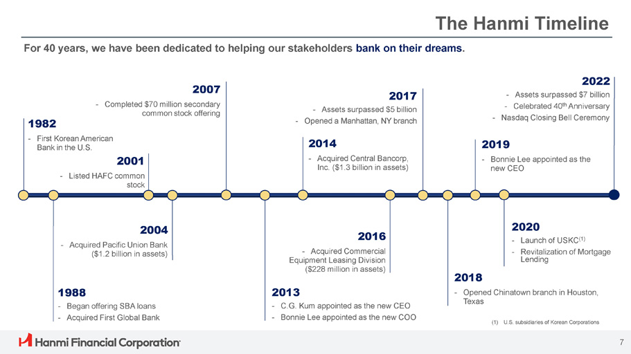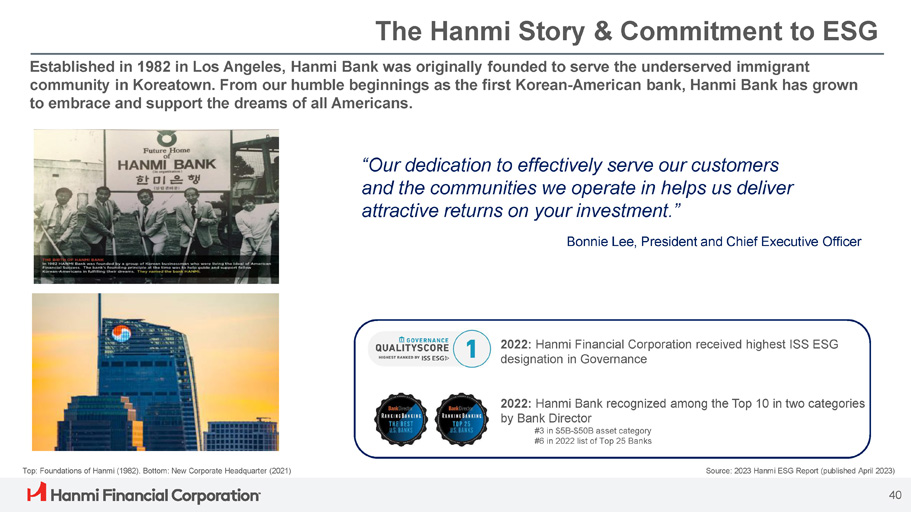 Top: Foundations of Hanmi (1982). Bottom: New Corporate Headquarter (2021) The Hanmi Story & Commitment to ESG Established in 1982 in Los Angeles, Hanmi Bank was originally founded to serve the underserved immigrant community in Koreatown. From our humble beginnings as the first Korean - American bank, Hanmi Bank has grown to embrace and support the dreams of all Americans. “Our dedication to effectively serve our customers and the communities we operate in helps us deliver attractive returns on your investment.” Bonnie Lee, President and Chief Executive Officer 2022: Hanmi Financial Corporation received highest ISS ESG designation in Governance 40 2022: Hanmi Bank recognized among the Top 10 in two categories by Bank Director #3 in $5B - $50B asset category #6 in 2022 list of Top 25 Banks Source: 2023 Hanmi ESG Report (published April 2023)