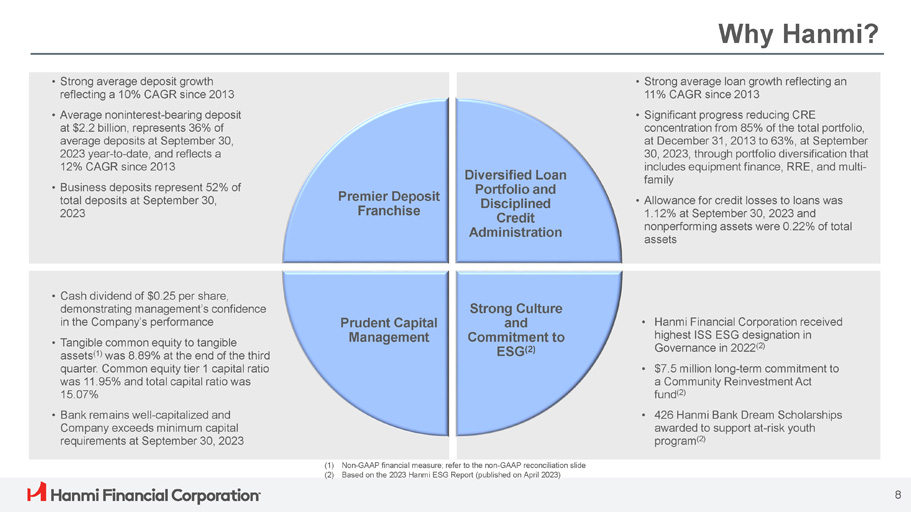 The Hanmi Timeline 1982 - First Korean American Bank in the U.S. 1988 - Began offering SBA loans - Acquired First Global Bank 2001 - Listed HAFC common stock 2004 - Acquired Pacific Union Bank ($1.2 billion in assets) 2007 - Completed $70 million secondary common stock offering 2013 - C.G. Kum appointed as the new CEO - Bonnie Lee appointed as the new COO 2014 - Acquired Central Bancorp, Inc. ($1.3 billion in assets) 2016 - Acquired Commercial Equipment Leasing Division ($228 million in assets) 2017 - Assets surpassed $5 billion - Opened a Manhattan, NY branch 2019 - Bonnie Lee appointed as the new CEO 2022 - Assets surpassed $7 billion - Celebrated 40 th Anniversary - Nasdaq Closing Bell Ceremony For 40 years, we have been dedicated to helping our stakeholders bank on their dreams . 7 2020 - Launch of USKC (1) - Revitalization of Mortgage Lending (1) U.S. subsidiaries of Korean Corporations 2018 - Opened Chinatown branch in Houston, Texas