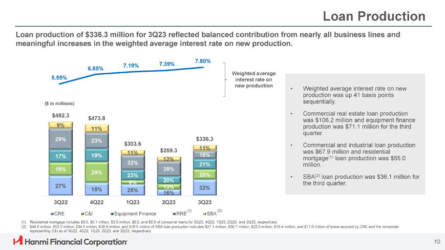 3Q23 Highlights Diluted EPS $0.62 ROAA 1.00% NIM 3.03% Efficiency Ratio 51.82% TBVPS (1) $21.45 Net Income $18.8M • Net income was $18.8 million, or $0.62 per diluted share, down 8.8% from $20.6 million, or $0.67 per diluted share, for the prior quarter » Net interest income was $54.9 million, down 1.0% from the prior quarter » Noninterest income was $11.2 million, up 41.5% from the prior quarter; includes $4.0 million gain on a branch sale - and - leaseback » Noninterest expense was $34.2 million, down 0.1% from the prior quarter » Efficiency ratio was 51.82%, compared with 54.11% for the prior quarter • Loans receivable were $6.02 billion, up 0.9% from the prior quarter » Loan production was $336.3 million with a weighted average interest rate of 7.80% • Deposits were $6.26 billion, down 0.9% from the prior quarter, with noninterest - bearing demand deposits representing 34.5% of total deposits » Cost of interest - bearing deposits was 3.53%, up 28 basis points from the prior quarter • Credit loss expense was $5.2 million; allowance for credit losses to loans was 1.12% at September 30, 2023 • Tangible common equity to tangible assets (1) was 8.89%, Common equity tier 1 capital ratio was 11.95% and total capital ratio was 15.07% ROAE 9.88% (1) Non - GAAP financial measure; refer to the non - GAAP reconciliation slide 9