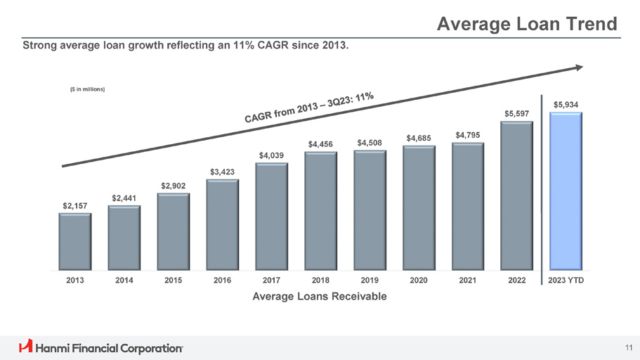 Hanmi Franchise at a Glance Loans $6.0B Deposits $6.3B TCE/TA (2) Ratio 8.89% Second Largest Korean - American Bank in the U.S. • Founded in 1982 in Los Angeles, as the first Korean - American bank • 35 full - service branches and 8 loan production offices across 9 states • Focused on MSAs with high Asian - American and multi - ethnic populations • Strong track record of growth • Well capitalized, significantly above regulatory requirements (1) CAGR based on the average loan growth between 2013, when new executive management was appointed, and 3Q23 (2) Non - GAAP financial measure; refer to the non - GAAP reconciliation slide Loan Growth (1) 10.9% TBVPS (2) $21.45 As of 3Q23 Total Assets $7.4B Experienced Bankers with Deep Community Ties 3 2 1 1 1 1 7 1 1 Branch Loan Production Office (LPO) 1 22 2 5