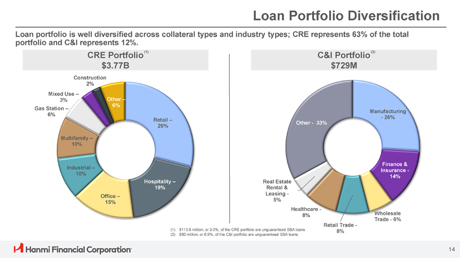 Loan Portfolio Commercial Real Estate (CRE) (1,2) Portfolio $3,773 Outstanding ($ in millions) 5.39% 3Q23 Average Yield $6.02 Billion Loan Portfolio (as of September 30, 2023) CRE 13 Owner - 12% CRE Multifamily - 7% C&I - 12% Equipment Finance - 10% (2) CRE Construction - 1% Note: Numbers may not add due to rounding (1) Includes syndicated loans of $278.6 million in total commitments ($220.8 million disbursed) across C&I ($249.3 million committed and $191.5 million disbursed) and CRE ($29.3 committed and disbursed) (2) Commercial Real Estate (CRE) is a combination of Investor (non - owner), Owner Occupied, Multifamily, and Construction. Investor (or non - owner occupied) property is where the investor does not occupy the property. The primary source of repayment stems from the rental income associated with the respective properties. Owner occupied property is where the borrower owns the property and also occupies it. The primary source of repayment is the cash flow from the ongoing operations and activities conducted by the borrower/owner. Multifamily real estate is a residential property that has 5 or more housing units. (3) Residential real estate is a loan (mortgage) secured by a single family residence, including one to four units (duplexes, triplexes, and fourplexes). RRE also includes $2.0 million of HELOCs and $4.2 million in consumer loans (4) Weighted average DCR and weighted average LTV calculated when the loan was first underwritten or renewed subsequently CRE (2) Multifamily 158 # of Loans 56.7% Weighted Average Loan - to - Value Ratio (4) 1.62x Weighted Average Debt Coverage Ratio (4) CRE (2) Investor (non - owner) 887 # of Loans 50.4% Weighted Average Loan - to - Value Ratio (4) 2.08x Weighted Average Debt Coverage Ratio (4) CRE (2) Owner Occupied 757 # of Loans 47.8% Weighted Average Loan - to - Value Ratio (4) 2.67x Weighted Average Debt Coverage Ratio (4) Residential Real Estate (RRE) (3) Portfolio $926 Outstanding ($ in millions) 4.83% 3Q23 Average Yield Commercial & Industrial (C&I) (1) Portfolio $729 Outstanding ($ in millions) 8.88% 3Q23 Average Yield Equipment Finance Portfolio $593 Outstanding ($ in millions) 5.56% 3Q23 Average Yield (2) (2) CRE Investor (non - owner) (2) - 43% (3) RRE - 15%