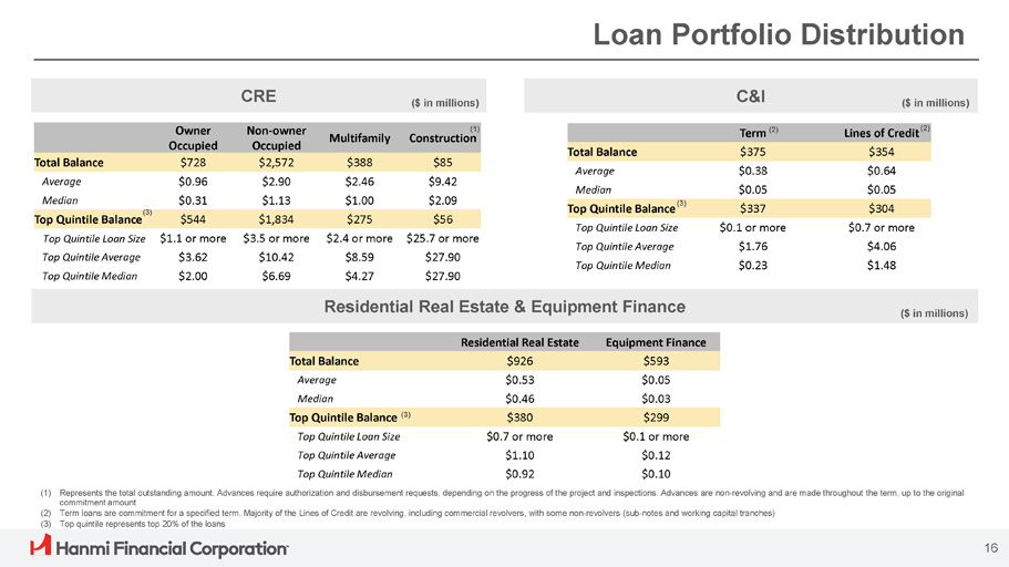 CRE Portfolio Geographical Exposure CRE Composition by State $3,773 Multifamily by State $388 Construction by State $85 Owner Occupied by State $728 Investor (Non - owner Occupied) by State $2,572 California – $2,595 69% Texas – $363 10% New York – $217 6% Illinois – $85 2% Other – $513 13% California – $214 55% Texas - $65 17% New York – $79 20% Illinois – $14 4% Other – $16 4% California – $60 71% Other – $7 7% New York – $18 22% California - $451 62% Texas – $44 6% New York – $7 1% Illinois – $15 2% Other – $211 29% California - $1,869 73% 15 Texas – $254 10% Illinois – $56 2% New York – $112 4% Other – $281 11% ($ in millions) ($ in millions)