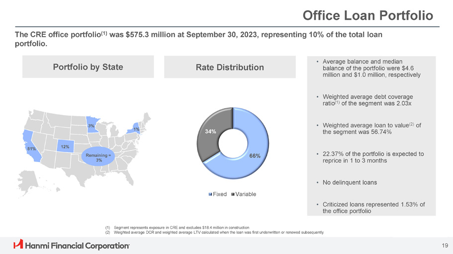 USKC (1) Loans & Deposits 35% 20% 13% 7% 6% 4% 3% 3% 3% 2% 4% Real Estate Investment Auto Part Manufacturer Hotel Food Education Golf Course Steel Electronics/Home Appliances Computer Equipment Healthcare Other USKC portfolio represented $719.6 million in loans, or 12% of the loan portfolio and $794.4 million in deposits, or 13% of the deposit portfolio. USKC CRE portfolio had a weighted average debt coverage ratio (2) of 1.91x and weighted average loan - to - value (2) of 60.6%. USKC Loans – Top 10 Industries (as of 3Q23) 20% 23% 25% 25% 26% 80% 77% 75% 75% 75% 3Q23 2Q23 1Q23 4Q22 3Q22 $772 $781 $764 $732 $720 USKC Loans by Product CRE C&I ($ in millions) USKC Deposits – Top 10 Industries (as of 3Q23) 36% Auto Part Manufacurer 12% Steel 8% Electronics/Home Appliances 6% RE Investment/Leasing 5% Food 5% Research and Development 3% Foreign Financial Institution 2% IT 2% Hospitality 4% All Other Financial Investment Activities 17% Other $795 49% $688 46% $565 32% $575 38% $547 38% 46% 49% 60% 58% 61% 3Q23 2Q23 1Q23 4Q22 3Q22 Demand Noninterest - bearing Money Market & Savings USKC Deposits by Product 18 ($ in millions) (1) U.S. subsidiaries of Korean Corporations (2) Weighted average DCR and weighted average LTV calculated when the loan was first underwritten or renewed subsequently (3) Time deposits, not illustrated, were 5% of total USKC deposits at September 30, 2023. Hence, the percentages do not add to 100% (3)