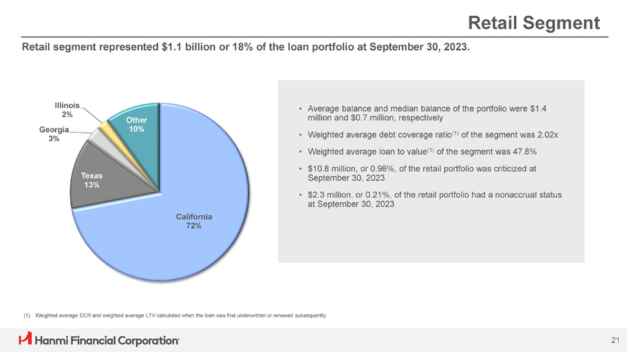 Retail Segment Retail segment represented $1.1 billion or 18% of the loan portfolio at September 30, 2023. (1) Weighted average DCR and weighted average LTV calculated when the loan was first underwritten or renewed subsequently • Average balance and median balance of the portfolio were $1.4 million and $0.7 million, respectively • Weighted average debt coverage ratio (1) of the segment was 2.02x • Weighted average loan to value (1) of the segment was 47.8% • $10.8 million, or 0.98%, of the retail portfolio was criticized at September 30, 2023 • $2.3 million, or 0.21%, of the retail portfolio had a nonaccrual status at September 30, 2023 California 72% 21 Texas 13% Illinois 2% Georgia 3% Other 10%