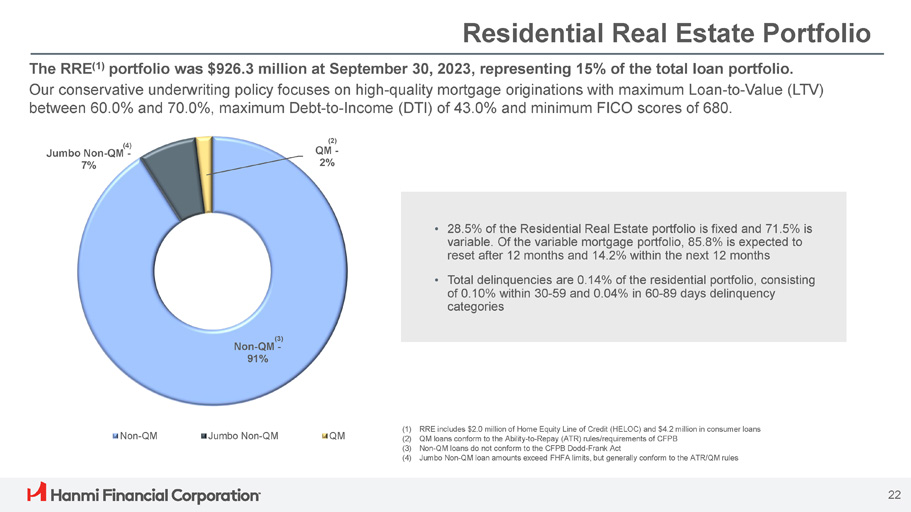 Residential Real Estate Portfolio (2) QM - 2% (3) Non - QM - 91% (4) Jumbo Non - QM - 7% Non - QM Jumbo Non - QM QM 22 The RRE (1) portfolio was $926.3 million at September 30, 2023, representing 15% of the total loan portfolio. Our conservative underwriting policy focuses on high - quality mortgage originations with maximum Loan - to - Value (LTV) between 60.0% and 70.0%, maximum Debt - to - Income (DTI) of 43.0% and minimum FICO scores of 680. (1) RRE includes $2.0 million of Home Equity Line of Credit (HELOC) and $4.2 million in consumer loans (2) QM loans conform to the Ability - to - Repay (ATR) rules/requirements of CFPB (3) Non - QM loans do not conform to the CFPB Dodd - Frank Act (4) Jumbo Non - QM loan amounts exceed FHFA limits, but generally conform to the ATR/QM rules • 28.5% of the Residential Real Estate portfolio is fixed and 71.5% is variable. Of the variable mortgage portfolio, 85.8% is expected to reset after 12 months and 14.2% within the next 12 months • Total delinquencies are 0.14% of the residential portfolio, consisting of 0.10% within 30 - 59 and 0.04% in 60 - 89 days delinquency categories