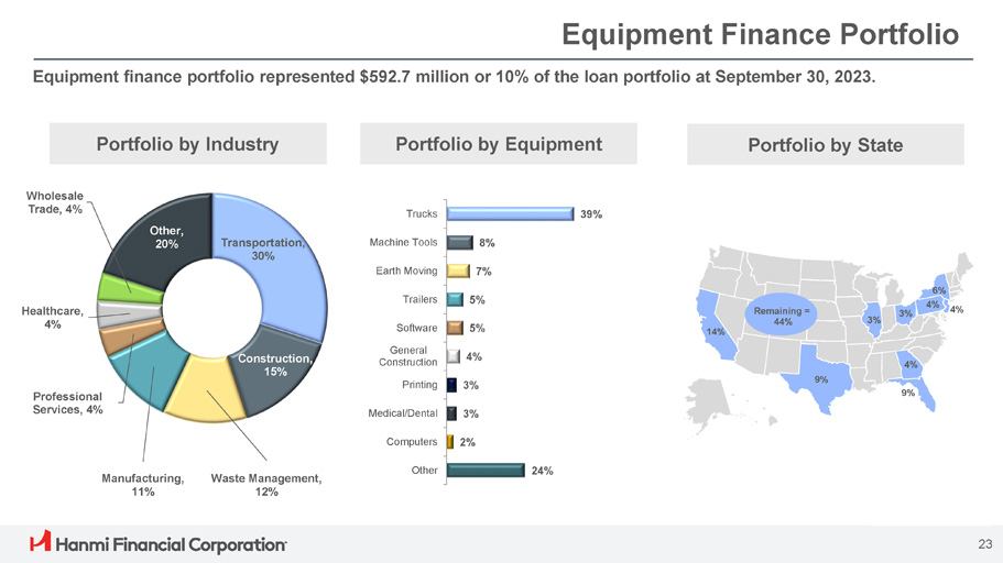 Equipment Finance Portfolio Equipment finance portfolio represented $592.7 million or 10% of the loan portfolio at September 30, 2023. Transportation, 30% Construction, 15% Waste Management, 12% Manufacturing, 11% Professional Services, 4% Healthcare, 4% Wholesale Trade, 4% Other, 20% 39% 8% 7% 5% 5% 4% General Construction 3% Printing 3% Medical/Dental 24% 2% Computers Other Trucks Machine Tools Earth Moving Trailers Software Portfolio by Industry Portfolio by Equipment Portfolio by State 14% 23 9% 4% 9% 6% 4% 3% 3% Remaining = 44% 4%
