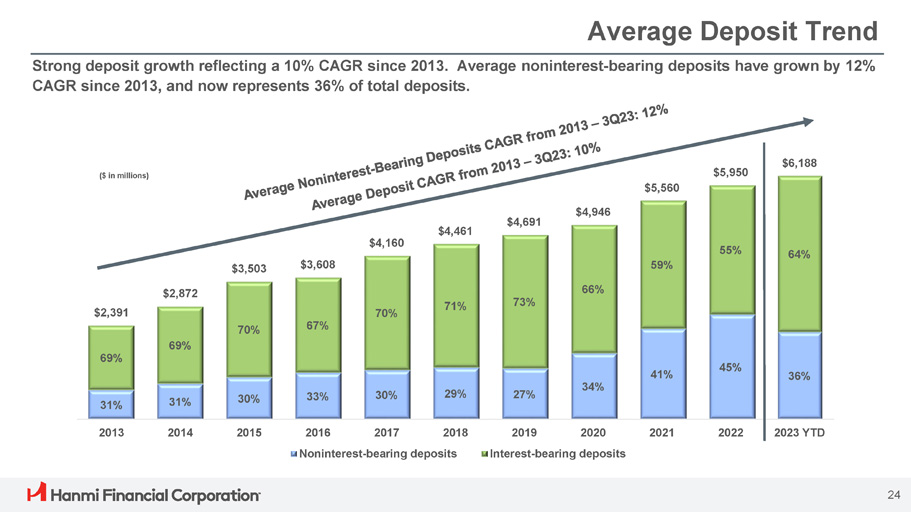 31% 31% 30% 33% 30% 29% 27% 34% 41% 45% 36% 69% 69% 70% 67% 70% 71% 73% 66% 59% 55% 64% $2,391 $2,872 $3,503 $3,608 $4,160 $4,461 $4,691 $5,560 $4,946 $5,950 $6,188 2013 2014 2015 2021 2022 2023 YTD 2016 2017 2018 Noninterest - bearing deposits 2019 2020 Interest - bearing deposits ($ in millions) Strong deposit growth reflecting a 10% CAGR since 2013. Average noninterest - bearing deposits have grown by 12% CAGR since 2013, and now represents 36% of total deposits. 24 Average Deposit Trend
