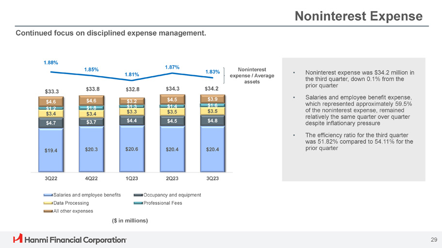 $2.6 26% $1.2 12% $0.8 8% $0.3 3% $5.1 51% Service charges on deposit accounts Trade finance and other service charges and fees Servicing income Bank - owned life insurance income All other operating income Noninterest Income SBA 7(a) Loan Production and Sales ($ in millions) $44.9 $53.2 $34.5 $30.9 $36.1 $43.7 $40.9 $29.7 $19.9 $21.0 6.67% 5.99% 7.85% 7.75% 6.84% 3Q22 4Q22 1Q23 SBA Loan Sales SBA Production 2Q23 3Q23 SBA Trade Premium Noninterest income for the third quarter was $11.2 million, up 42% from the previous quarter, which primarily reflected $4.0 million gain on the sale - and - leaseback of a branch property. Noninterest Income 3Q23 Service Charges and Fees ($ in millions) ($ in millions) $6.7 $5.5 $6.5 $6.7 $2.3 $1.9 $1.9 $1.2 $8.9 $7.5 $8.3 $11.2 $1.2 3Q22 4Q22 1Q23 2Q23 3Q23 Service charges, fees & other Securities transactions Gain on sale of SBA loans Legal settlements Total noninterest income ($1.9) 28 $7.9 $1.9 (1) $10.0 (1) Includes $4.0 million gain on the sale - and - leaseback of bank premises