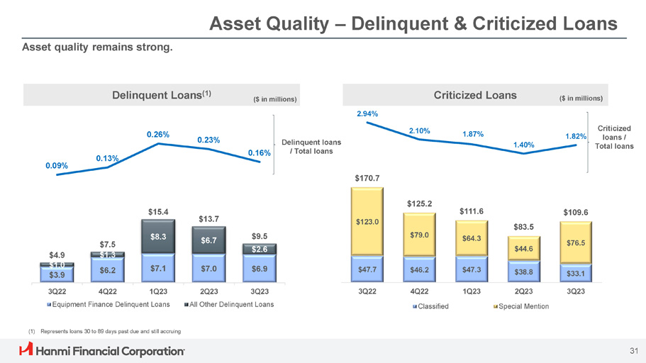 Pretax, Pre - Provision Income (PTPP) (1) $29.1 $27.8 2.17% 2.09% 1Q23 3Q22 4Q22 Gain on sale of Bank premise 2Q23 3Q23 Pretax, pre - provision income Average 30 Pretax, pre - provision income was $31.8 million for the third quarter, up 9.5% from the prior quarter and down 17.8% from the same quarter last year • PTPP / assets (1) 1.70% (1) 1.49% 1.58% 1.84% $38.2 $38.7 PTPP over average assets for 3Q23 was 1.70% compared with 1.58% for the prior quarter Excluding the $4.0 million gain on a branch sale - and - • • $31.8 $4.0 $29.1 $33.4 leaseback, PTPP was $27.8 million, down 4.3% from the prior quarter, and adjusted PTPP over average assets (1) was 1.49% $33.4 $38.2 $38.7 ($ in millions) (1) Refer to PTPP schedule in appendix