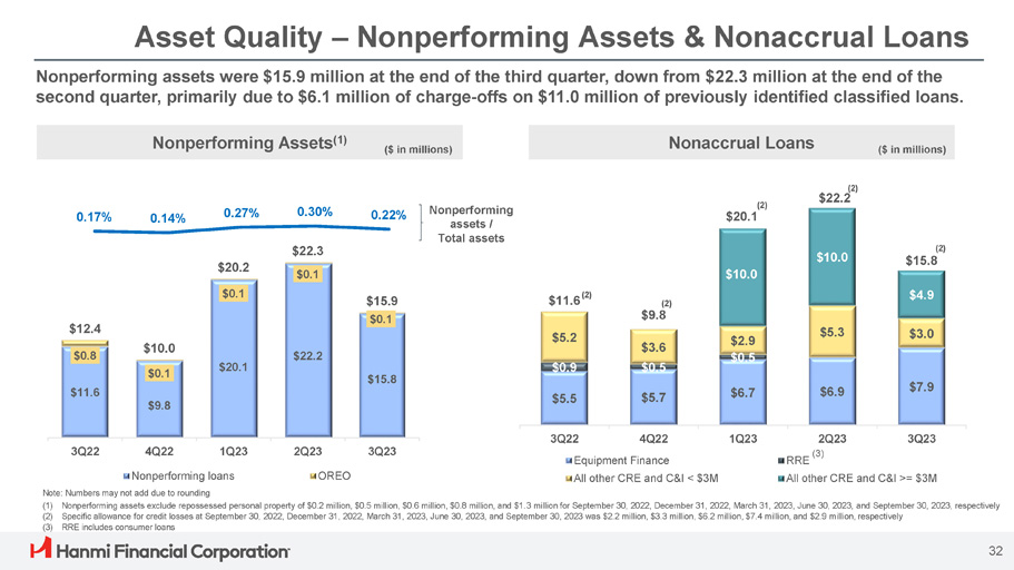 Asset Quality – Delinquent & Criticized Loans Delinquent loans / Total loans $47.7 $46.2 $47.3 $38.8 $33.1 $123.0 $79.0 $64.3 $44.6 $76.5 $170.7 $125.2 $111.6 $83.5 $109.6 2.94% 2.10% 1.87% 1.40% 1.82% 3Q22 4Q22 1Q23 2Q23 3Q23 Classified Special Mention Delinquent Loans (1) Criticized Loans Criticized loans / Total loans Asset quality remains strong. $7.1 $7.0 $6.9 $8.3 $6.7 $4.9 $1.0 $3.9 $7.5 $1.3 $6.2 $15.4 $13.7 $9.5 $2.6 0.09% 0.13% 0.26% 0.23% 0.16% 3Q22 4Q22 1Q23 Equipment Finance Delinquent Loans 2Q23 3Q23 All Other Delinquent Loans ($ in millions) 31 ($ in millions) (1) Represents loans 30 to 89 days past due and still accruing