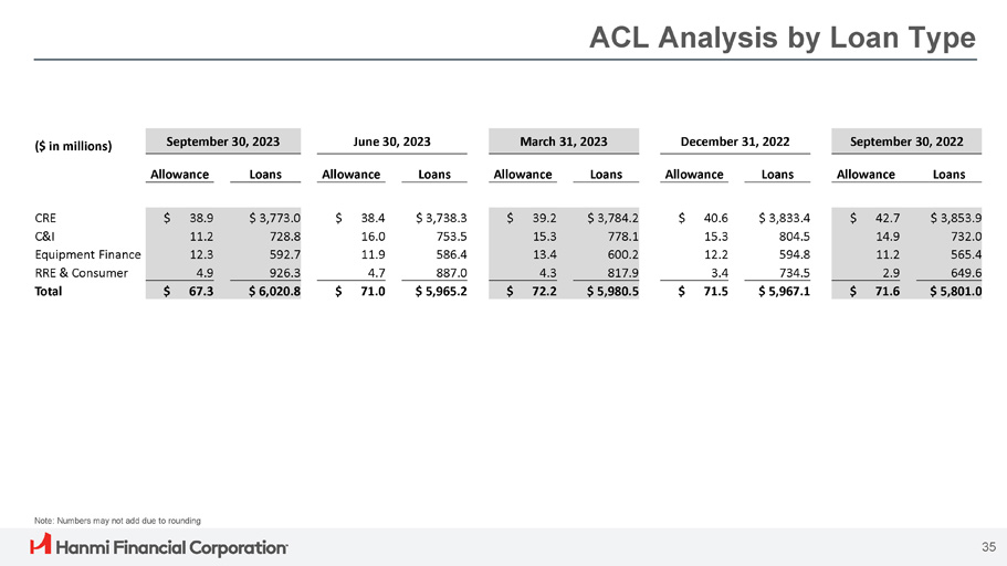 ACL Trends Allowance for credit losses was $67.3 million as of September 30, 2023, generating an allowance for credit losses to loans of 1.12% compared with 1.19% at the end of the prior quarter. $71.6 $71.5 $72.2 $71.0 $67.3 1.23% 1.20% 1.21% 1.19% 1.12% 3Q22 4Q22 1Q23 2Q23 3Q23 Allowance for credit losses ACL to Loans ($0.1) $0.6 $0.1 $2.1 $5.2 3Q22 4Q22 1Q23 2Q23 3Q23 Credit loss recovery Credit loss expense Allowance for Credit Losses Credit Loss Expense (Recovery) 34 ($ in millions) ($ in millions)
