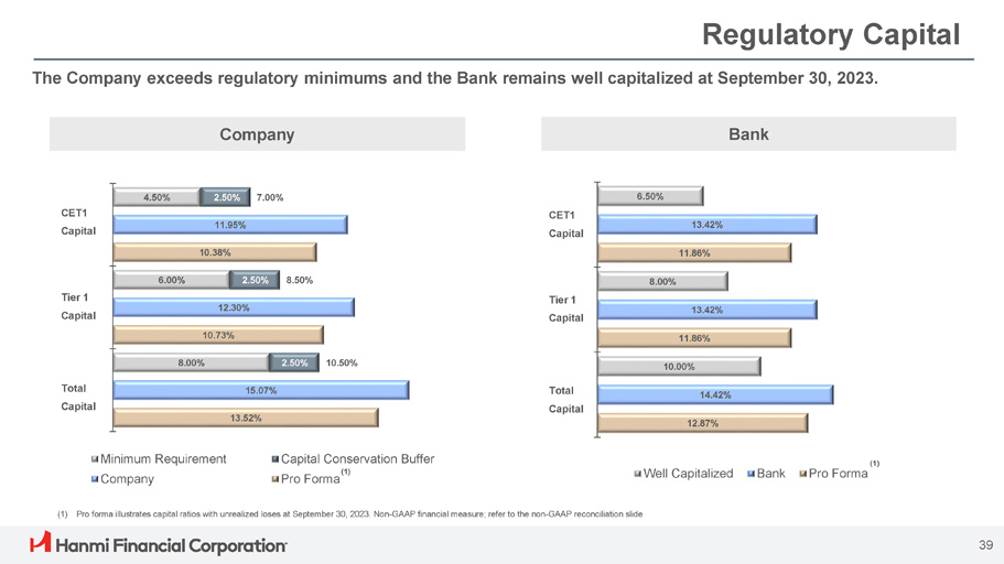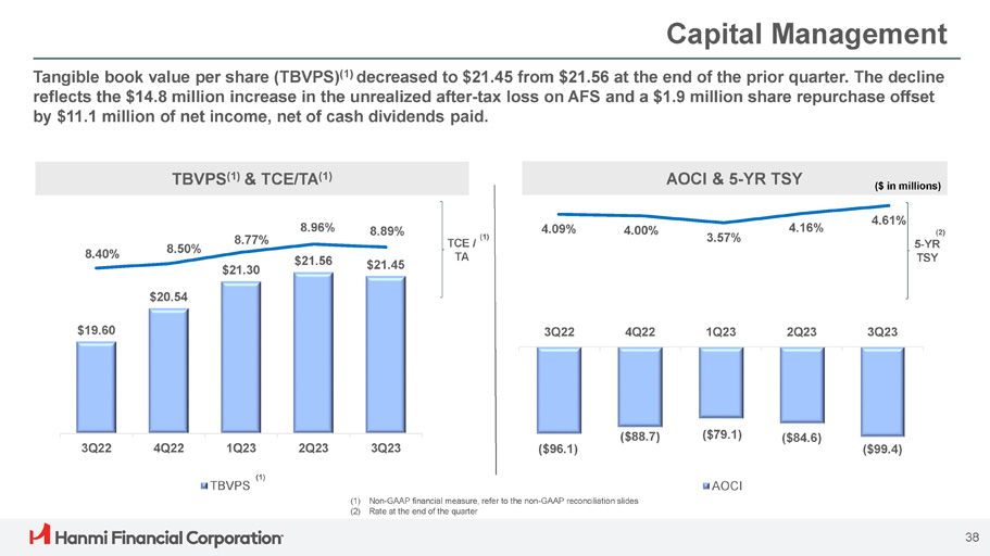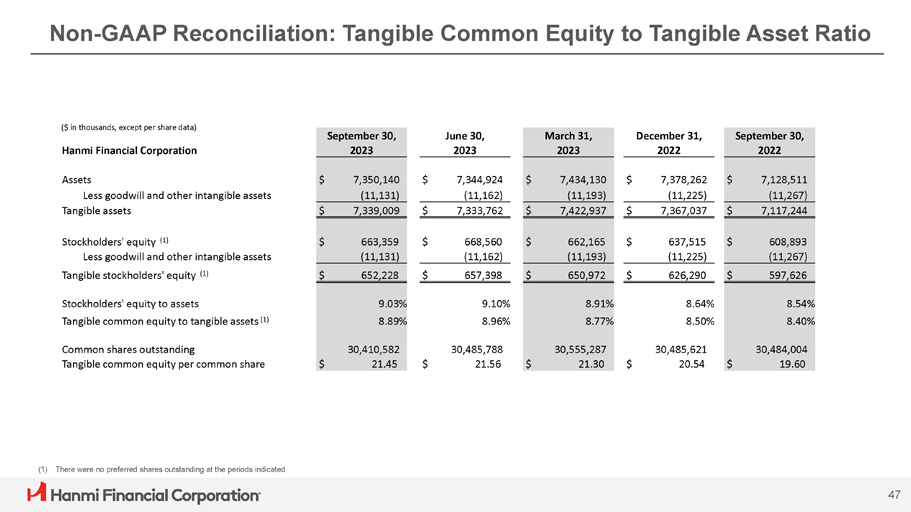 Non - GAAP Reconciliation: Tangible Common Equity to Tangible Asset Ratio 47 (1) There were no preferred shares outstanding at the periods indicated September 30, December 31, March 31, June 30, September 30, 2022 2022 2023 2023 2023 Hanmi Financial Corporation $ 7,128,511 $ 7,378,262 $ 7,434,130 $ 7,344,924 $ 7,350,140 Assets (11,267) (11,225) (11,193) (11,162) (11,131) Less goodwill and other intangible assets $ 7,117,244 $ 7,367,037 $ 7,422,937 $ 7,333,762 $ 7,339,009 Tangible assets $ 608,893 $ 637,515 $ 662,165 $ 668,560 $ 663,359 Stockholders' equity (1) (11,267) (11,225) (11,193) (11,162) (11,131) Less goodwill and other intangible assets $ 597,626 $ 626,290 $ 650,972 $ 657,398 $ 652,228 Tangible stockholders' equity (1) 8.54% 8.64% 8.91% 9.10% 9.03% Stockholders' equity to assets 8.40% 8.50% 8.77% 8.96% 8.89% Tangible common equity to tangible assets (1) 30,484,004 30,485,621 30,555,287 30,485,788 30,410,582 Common shares outstanding $ 19.60 $ 20.54 $ 21.30 $ 21.56 $ 21.45 Tangible common equity per common share ($ in thousands, except per share data)