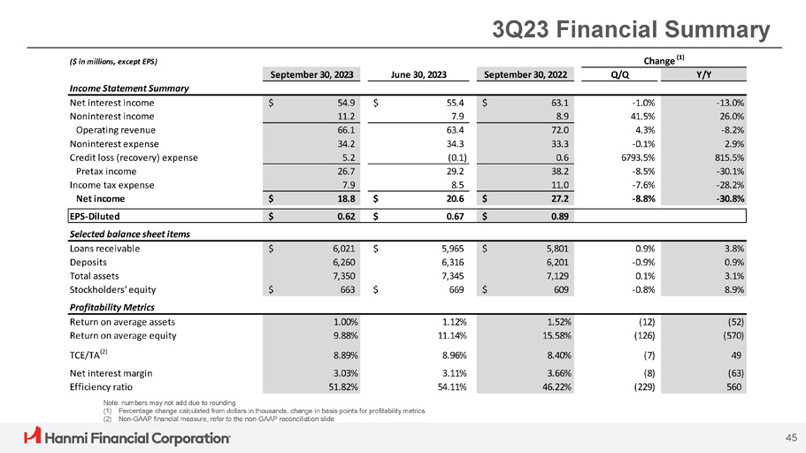 Hanmi Financial Corporation (the “Company”) cautions investors that any statements contained herein that are not historical facts are forward - looking statements within the meaning of the “safe harbor” provisions of the Private Securities Litigation Reform Act of 1995 , including, but not limited to, those statements regarding operating and financial performance, financial position and liquidity, business strategies, regulatory, economic and competitive outlook, investment and expenditure plans, capital and financing needs and availability, litigation, plans and objectives, merger or sale activity, the effects of COVID - 19 on our business, financial condition and results of operations, and all other forecasts and statements of expectation or assumption underlying any of the foregoing . These statements involve known and unknown risks and uncertainties that are difficult to predict . Investors should not rely on any forward - looking statement and should consider risks, such as changes in governmental policy, legislation and regulations, economic uncertainty and changes in economic conditions, inflation, the continuing impact of the COVID - 19 pandemic on our business and results of operations, fluctuations in interest rate and credit risk, competitive pressures, the ability to succeed in new markets, balance sheet management, liquidity and sources of funding, the size and composition of our deposit portfolio, a potential government shutdown, including the percentage of uninsured deposits in the portfolio, increased assessments by the Federal Deposit Insurance Corporation, and other operational factors . Forward - looking statements are based upon the good faith beliefs and expectations of management as of this date only and are further subject to additional risks and uncertainties, including, but not limited to, the risk factors set forth in our earnings release dated October 24 , 2023 , including the section titled “Forward Looking Statements and the Company’s most recent Form 10 - K, 10 - Q and other filings with the Securities and Exchange Commission (“SEC”) . Investors are urged to review our earnings release dated October 24 , 2023 , including the section titled “Forward Looking Statements and the Company’s SEC filings . The Company disclaims any obligation to update or revise the forward - looking statements herein . 2 Forward - Looking Statements