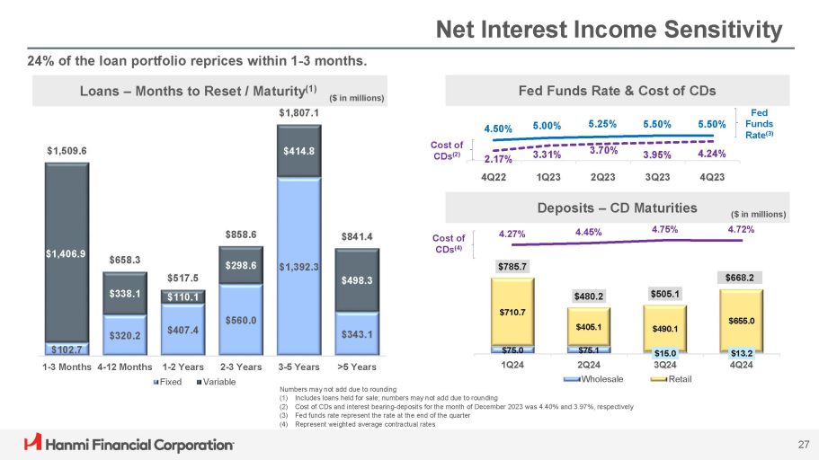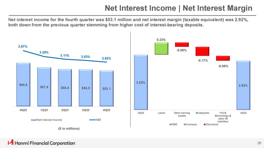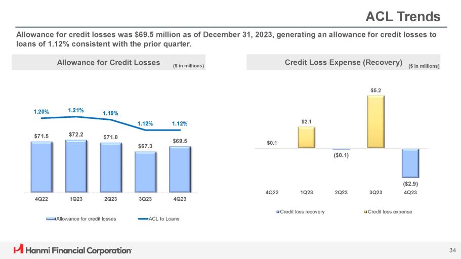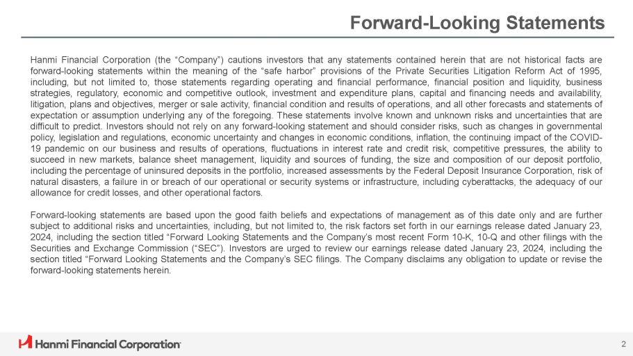 Hanmi Financial Corporation (the “Company”) cautions investors that any statements contained herein that are not historical facts are forward - looking statements within the meaning of the “safe harbor” provisions of the Private Securities Litigation Reform Act of 1995 , including, but not limited to, those statements regarding operating and financial performance, financial position and liquidity, business strategies, regulatory, economic and competitive outlook, investment and expenditure plans, capital and financing needs and availability, litigation, plans and objectives, merger or sale activity, financial condition and results of operations, and all other forecasts and statements of expectation or assumption underlying any of the foregoing . These statements involve known and unknown risks and uncertainties that are difficult to predict . Investors should not rely on any forward - looking statement and should consider risks, such as changes in governmental policy, legislation and regulations, economic uncertainty and changes in economic conditions, inflation, the continuing impact of the COVID - 19 pandemic on our business and results of operations, fluctuations in interest rate and credit risk, competitive pressures, the ability to succeed in new markets, balance sheet management, liquidity and sources of funding, the size and composition of our deposit portfolio, including the percentage of uninsured deposits in the portfolio, increased assessments by the Federal Deposit Insurance Corporation, risk of natural disasters, a failure in or breach of our operational or security systems or infrastructure, including cyberattacks, the adequacy of our allowance for credit losses, and other operational factors . Forward - looking statements are based upon the good faith beliefs and expectations of management as of this date only and are further subject to additional risks and uncertainties, including, but not limited to, the risk factors set forth in our earnings release dated January 23 , 2024 , including the section titled “Forward Looking Statements and the Company’s most recent Form 10 - K, 10 - Q and other filings with the Securities and Exchange Commission (“SEC”) . Investors are urged to review our earnings release dated January 23 , 2024 , including the section titled “Forward Looking Statements and the Company’s SEC filings . The Company disclaims any obligation to update or revise the forward - looking statements herein . 2 Forward - Looking Statements