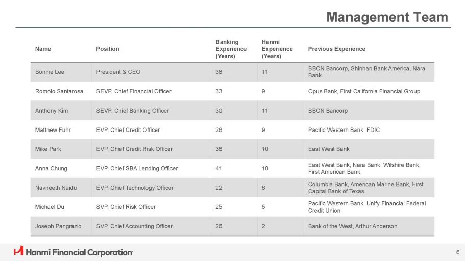 Previous Experience Hanmi Experience (Years) Banking Experience (Years) Position Name BBCN Bancorp, Shinhan Bank America, Nara Bank 11 38 President & CEO Bonnie Lee Opus Bank, First California Financial Group 9 33 SEVP, Chief Financial Officer Romolo Santarosa BBCN Bancorp 11 30 SEVP, Chief Banking Officer Anthony Kim Pacific Western Bank, FDIC 9 28 EVP, Chief Credit Officer Matthew Fuhr East West Bank 10 36 EVP, Chief Credit Risk Officer Mike Park East West Bank, Nara Bank, Wilshire Bank, First American Bank 10 41 EVP, Chief SBA Lending Officer Anna Chung Columbia Bank, American Marine Bank, First Capital Bank of Texas 6 22 EVP, Chief Technology Officer Navneeth Naidu Pacific Western Bank, Unify Financial Federal Credit Union 5 25 SVP, Chief Risk Officer Michael Du Bank of the West, Arthur Anderson 2 26 SVP, Chief Accounting Officer Joseph Pangrazio 6 Management Team
