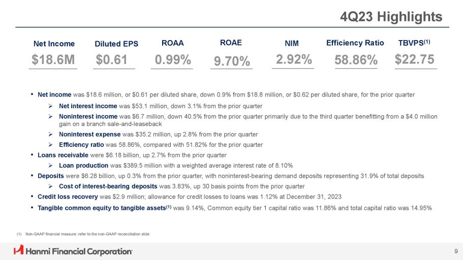 Why Hanmi? • Strong average loan growth reflecting an 11% CAGR since 2013 • Significant progress reducing CRE concentration from 85% of the total portfolio, at December 31, 2013 to 63%, at December 31, 2023, through portfolio diversification that includes equipment finance, RRE, and multi - family • Allowance for credit losses to loans was 1.12% at December 31, 2023 and nonperforming assets were 0.21% of total assets • Strong average deposit growth reflecting a 10% CAGR since 2013 • Average noninterest - bearing deposit at $2.2 billion, represents 35% of average deposits at December 31, 2023 year - to - date, and reflects a 11% CAGR since 2013 • Business deposits represent 52% of total deposits at December 31, 2023 Premier Deposit Franchise Diversified Loan Portfolio and Disciplined Credit Administration 8 Strong Culture and Corporate Sustainability Prudent Capital Management • Cash dividend of $0.25 per share, demonstrating management’s confidence in the Company’s performance • Tangible common equity to tangible assets (1) was 9.14% at the end of the Fourth quarter. Common equity tier 1 capital ratio was 11.86% and total capital ratio was 14.95% • Bank remains well - capitalized and Company exceeds minimum capital requirements at December 31, 2023 • Hanmi Financial Corporation received highest ISS ESG designation in Governance in 2022 (2) • $7.5 million long - term commitment to a Community Reinvestment Act fund (2) • 426 Hanmi Bank Dream Scholarships awarded to support at - risk youth program (2) (1) Non - GAAP financial measure; refer to the non - GAAP reconciliation slide (2) Based on the 2023 Hanmi ESG Report (published on April 2023)