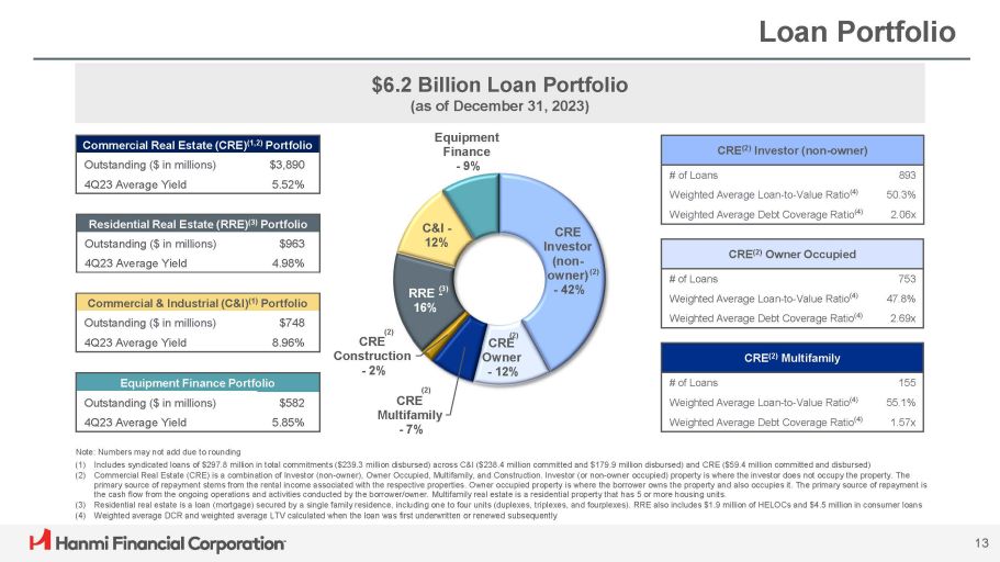Loan Portfolio Commercial Real Estate (CRE) (1,2) Portfolio $3,890 Outstanding ($ in millions) 5.52% 4Q23 Average Yield $6.2 Billion Loan Portfolio (as of December 31, 2023) CRE 13 Owner - 12% C&I - 12% Equipment Finance - 9% (2) CRE Construction - 2% (2) CRE Multifamily - 7% Note: Numbers may not add due to rounding (1) Includes syndicated loans of $297.8 million in total commitments ($239.3 million disbursed) across C&I ($238.4 million committed and $179.9 million disbursed) and CRE ($59.4 million committed and disbursed) (2) Commercial Real Estate (CRE) is a combination of Investor (non - owner), Owner Occupied, Multifamily, and Construction. Investor (or non - owner occupied) property is where the investor does not occupy the property. The primary source of repayment stems from the rental income associated with the respective properties. Owner occupied property is where the borrower owns the property and also occupies it. The primary source of repayment is the cash flow from the ongoing operations and activities conducted by the borrower/owner. Multifamily real estate is a residential property that has 5 or more housing units. (3) Residential real estate is a loan (mortgage) secured by a single family residence, including one to four units (duplexes, triplexes, and fourplexes). RRE also includes $1.9 million of HELOCs and $4.5 million in consumer loans (4) Weighted average DCR and weighted average LTV calculated when the loan was first underwritten or renewed subsequently CRE (2) Multifamily 155 # of Loans 55.1% Weighted Average Loan - to - Value Ratio (4) 1.57x Weighted Average Debt Coverage Ratio (4) CRE (2) Investor (non - owner) 893 # of Loans 50.3% Weighted Average Loan - to - Value Ratio (4) 2.06x Weighted Average Debt Coverage Ratio (4) CRE (2) Owner Occupied 753 # of Loans 47.8% Weighted Average Loan - to - Value Ratio (4) 2.69x Weighted Average Debt Coverage Ratio (4) Residential Real Estate (RRE) (3) Portfolio $963 Outstanding ($ in millions) 4.98% 4Q23 Average Yield Commercial & Industrial (C&I) (1) Portfolio $748 Outstanding ($ in millions) 8.96% 4Q23 Average Yield Equipment Finance Portfolio $582 Outstanding ($ in millions) 5.85% 4Q23 Average Yield (2) CRE Investor (non - owner) (2) - 42% RRE - (3) 16%
