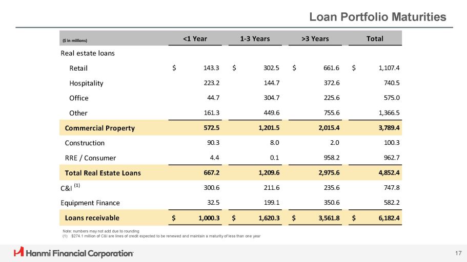 Loan Portfolio Distribution CRE C&I ($ in millions) ($ in millions) Construction (1) Multifamily Non - owner Occupied Owner Occupied $100 $419 $2,607 $763 Total Balance $11.15 $2.70 $2.95 $1.01 Average $7.99 $1.11 $1.12 $0.32 Median $58 $302 $1,866 $573 (3) Top Quintile Balance $22.3 or more $2.5 or more $3.5 or more $1.2 or more Top Quintile Loan Size $29.23 $9.74 $10.67 $3.82 Top Quintile Average $29.23 $4.71 $6.79 $2.09 Top Quintile Median Lines of Credit (2) Term (2) $374 $374 Total Balance $0.64 $0.36 Average $0.06 $0.05 Median $314 $331 Top Quintile Balance (3) $0.7 or more $0.1 or more Top Quintile Loan Size $3.78 $1.63 Top Quintile Average $1.43 $0.24 Top Quintile Median Residential Real Estate & Equipment Finance 16 Equipment Finance Residential Real Estate $582 $963 Total Balance $0.05 $0.54 Average $0.03 $0.46 Median $298 $397 Top Quintile Balance (3) $0.1 or more $0.7 or more Top Quintile Loan Size $0.12 $1.12 Top Quintile Average $0.10 $0.92 Top Quintile Median ($ in millions) (1) Represents the total outstanding amount. Advances require authorization and disbursement requests, depending on the progress of the project and inspections. Advances are non - revolving and are made throughout the term, up to the original commitment amount (2) Term loans are commitment for a specified term. Majority of the Lines of Credit are revolving, including commercial revolvers, with some non - revolvers (sub - notes and working capital tranches) (3) Top quintile represents top 20% of the loans