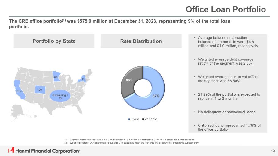 USKC (1) Loans & Deposits 33% 21% 20% 6% 4% 3% 3% 3% 2% 2% 3% Real Estate Investment Hotel Auto Part Manufacturer Food Education Golf Course Electronics/Home Appliances Computer Equipment Steel Transportation Other USKC portfolio represented $764.1 million in loans, or 12% of the loan portfolio and $818.7 million in deposits, or 13% of the deposit portfolio. USKC CRE portfolio had a weighted average debt coverage ratio (2) of 1.94x and weighted average loan - to - value (2) of 58.2%. USKC Loans – Top 10 Industries (as of 4Q23) 75% 75% 77% 80% 80% $781 25% $764 25% $732 23% $720 20% $764 20% U.S. subsidiaries of Korean Corporations Weighted average DCR and weighted average LTV calculated when the loan was first underwritten or renewed subsequently (1) (2) 4Q23 3Q23 2Q23 1Q23 4Q22 Time deposits, not illustrated, were 5% of total USKC deposits at December 31, 2023. Hence, the percentages do not add to 100% (3) CRE C&I USKC Loans by Product ($ in millions) USKC Deposits – Top 10 Industries (as of 4Q23) 27% Auto Part Manufacurer 11% Steel 10% Electronics/Home Appliances 6% All Other Financial Investment Activities 5% RE Investment/Leasing 5% Food 4% Research and Development 3% IT 3% Tire 3% Hospitality 23% Other 49% 46% 41% $575 38% 58% $565 32% 60% $688 46% $795 $819 49% 54% 4Q22 1Q23 2Q23 3Q23 4Q23 Demand Noninterest - bearing Money Market & Savings USKC Deposits by Product 18 ($ in millions) (3)