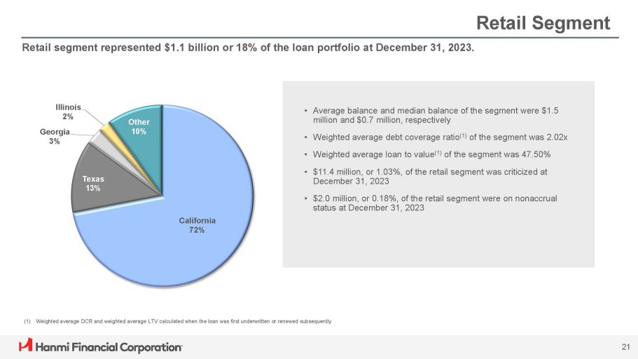 Retail Segment Retail segment represented $1.1 billion or 18% of the loan portfolio at December 31, 2023. (1) Weighted average DCR and weighted average LTV calculated when the loan was first underwritten or renewed subsequently • Average balance and median balance of the segment were $1.5 million and $0.7 million, respectively • Weighted average debt coverage ratio (1) of the segment was 2.02x • Weighted average loan to value (1) of the segment was 47.50% • $11.4 million, or 1.03%, of the retail segment was criticized at December 31, 2023 • $2.0 million, or 0.18%, of the retail segment were on nonaccrual status at December 31, 2023 California 72% 21 Texas 13% Illinois 2% Georgia 3% Other 10%