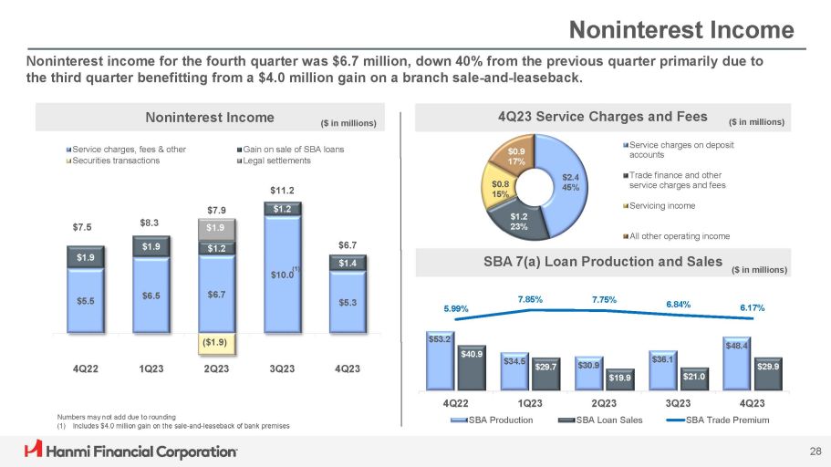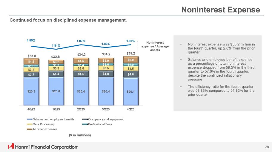 $2.4 45% $1.2 23% $0.8 15% $0.9 17% Service charges on deposit accounts Trade finance and other service charges and fees Servicing income All other operating income Noninterest Income SBA 7(a) Loan Production and Sales ($ in millions) $53.2 $34.5 $30.9 $36.1 $48.4 $40.9 $29.7 $19.9 $21.0 $29.9 5.99% 7.85% 7.75% 6.84% 6.17% 4Q22 1Q23 2Q23 SBA Loan Sales SBA Production 3Q23 4Q23 SBA Trade Premium Noninterest income for the fourth quarter was $6.7 million, down 40% from the previous quarter primarily due to the third quarter benefitting from a $4.0 million gain on a branch sale - and - leaseback. Noninterest Income 4Q23 Service Charges and Fees ($ in millions) ($ in millions) $5.5 $6.5 $6.7 $10.0 $5.3 $1.9 $1.9 $1.2 $1.4 $7.5 $8.3 $11.2 $1.2 $6.7 4Q22 1Q23 2Q23 3Q23 4Q23 Service charges, fees & other Securities transactions Gain on sale of SBA loans Legal settlements ($1.9) 28 $7.9 $1.9 (1) Numbers may not add due to rounding (1) Includes $4.0 million gain on the sale - and - leaseback of bank premises