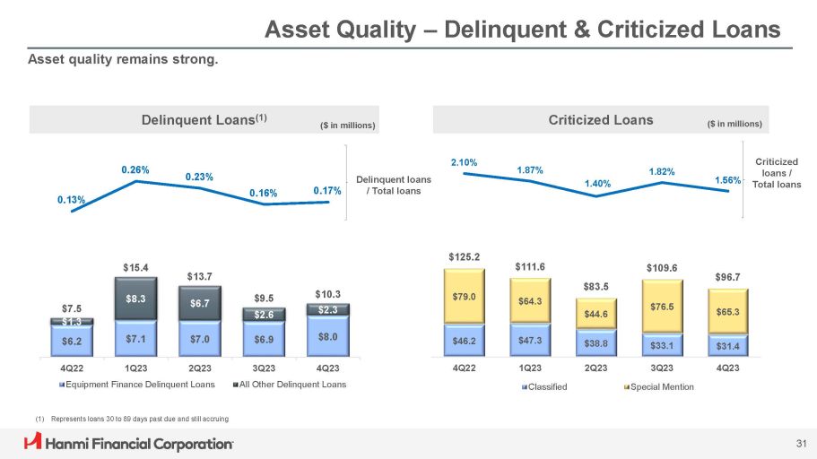Pretax, Pre - Provision Income (PTPP) (1) • Pretax, pre - provision income was $ 24 . 6 million for the fourth quarter, down 22 . 7 % from the prior quarter and down 35 . 5 % from the same quarter last year • PTPP over average assets for 4Q23 was 1.31% compared with 1.70% for the prior quarter $38.2 $33.4 $29.1 $27.8 $24.6 $4.0 $38.2 $33.4 $29.1 $31.8 $24.6 2.09% 1.84% 1.58% 1.70% 1.31% 1.49% 2Q23 4Q22 1Q23 Gain on sale of Bank premise 3Q23 4Q23 Pretax, pre - provision income PTPP / Average assets (1) 30 ($ in millions) (1) Refer to PTPP schedule in appendix (1)