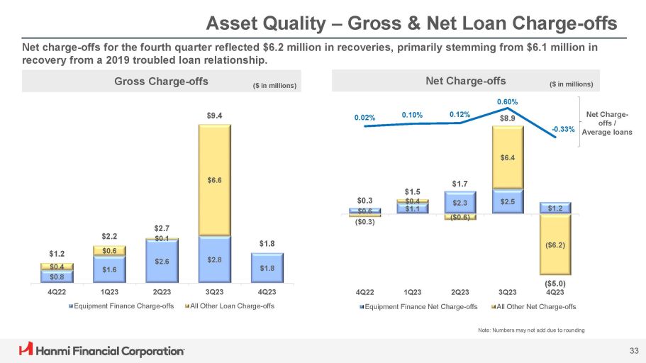 $9.8 $20.1 $22.2 $15.8 $15.5 $0.1 $0.1 $0.1 $0.1 $0.1 $10.0 $20.2 $22.3 $15.9 $15.6 3Q23 4Q23 4Q22 1Q23 2Q23 Nonperforming loans Note: Numbers may not add due to rounding OREO Asset Quality – Nonperforming Assets & Nonaccrual Loans 0.14% 0.27% 0.30% 0.22% 0.21% Nonperforming assets / Total assets Nonperforming Assets (1) Nonaccrual Loans Nonperforming assets were $15.6 million at the end of the fourth quarter, down from $15.9 million at the end of the third quarter. ($ in millions) ($ in millions) (1) Nonperforming assets exclude repossessed personal property of $0.5 million, $0.6 million, $0.8 million, $1.3 million, and $1.3 million for December 31, 2022, March 31, 2023, June 30, 2023, September 30, 2023, and December 31, 2023 respectively (2) Specific allowance for credit losses at December 31, 2022, March 31, 2023, June 30, 2023, September 30, 2023, and December 31, 2023 was $3.3 million, $6.2 million, $7.4 million, $2.9 million, and $3.4 million respectively (3) RRE includes consumer loans $5.7 $6.7 $6.9 $7.9 $7.3 $3.6 $0.5 $2.9 $0.5 $5.3 $3.0 $3.3 $10.0 $4.9 $4.9 (2) $9.8 (2) $22.2 2Q23 3Q23 (3) (2) $20.1 (2) $15.5 (2) $15.8 4Q23 RRE 4Q22 1Q23 Equipment Finance All other CRE and C&I < $3M All other CRE and C&I >= $3M 32 $10.0