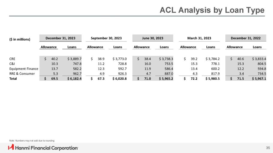 ACL Trends Allowance for credit losses was $69.5 million as of December 31, 2023, generating an allowance for credit losses to loans of 1.12% consistent with the prior quarter. $71.5 $72.2 $71.0 $67.3 $69.5 1.20% 1.21% 1.19% 1.12% 1.12% 4Q22 1Q23 2Q23 3Q23 4Q23 Allowance for credit losses ACL to Loans ($0.1) $0.1 $2.1 ($2.9) 4Q23 $5.2 4Q22 1Q23 2Q23 3Q23 Credit loss recovery Credit loss expense Allowance for Credit Losses Credit Loss Expense (Recovery) 34 ($ in millions) ($ in millions)